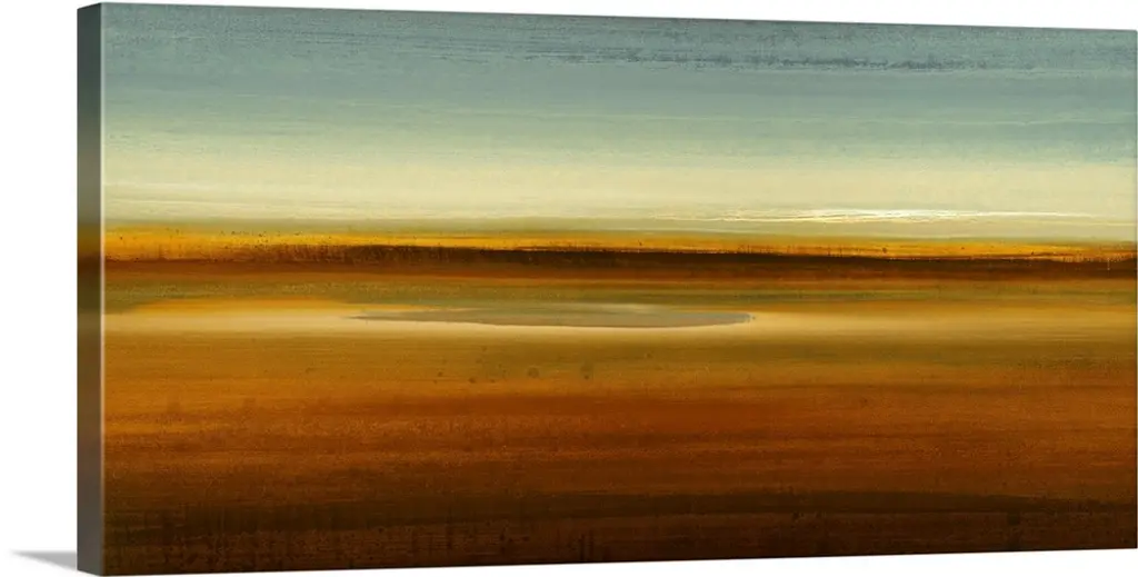 A contemporary abstract painting using earthy tones toward the bottom of the image and light sky tones toward the top resembling a landscape.