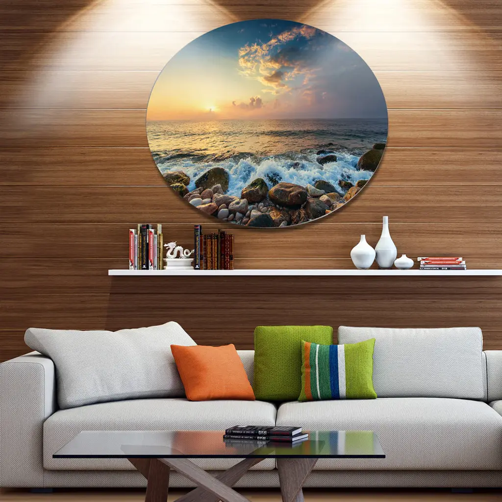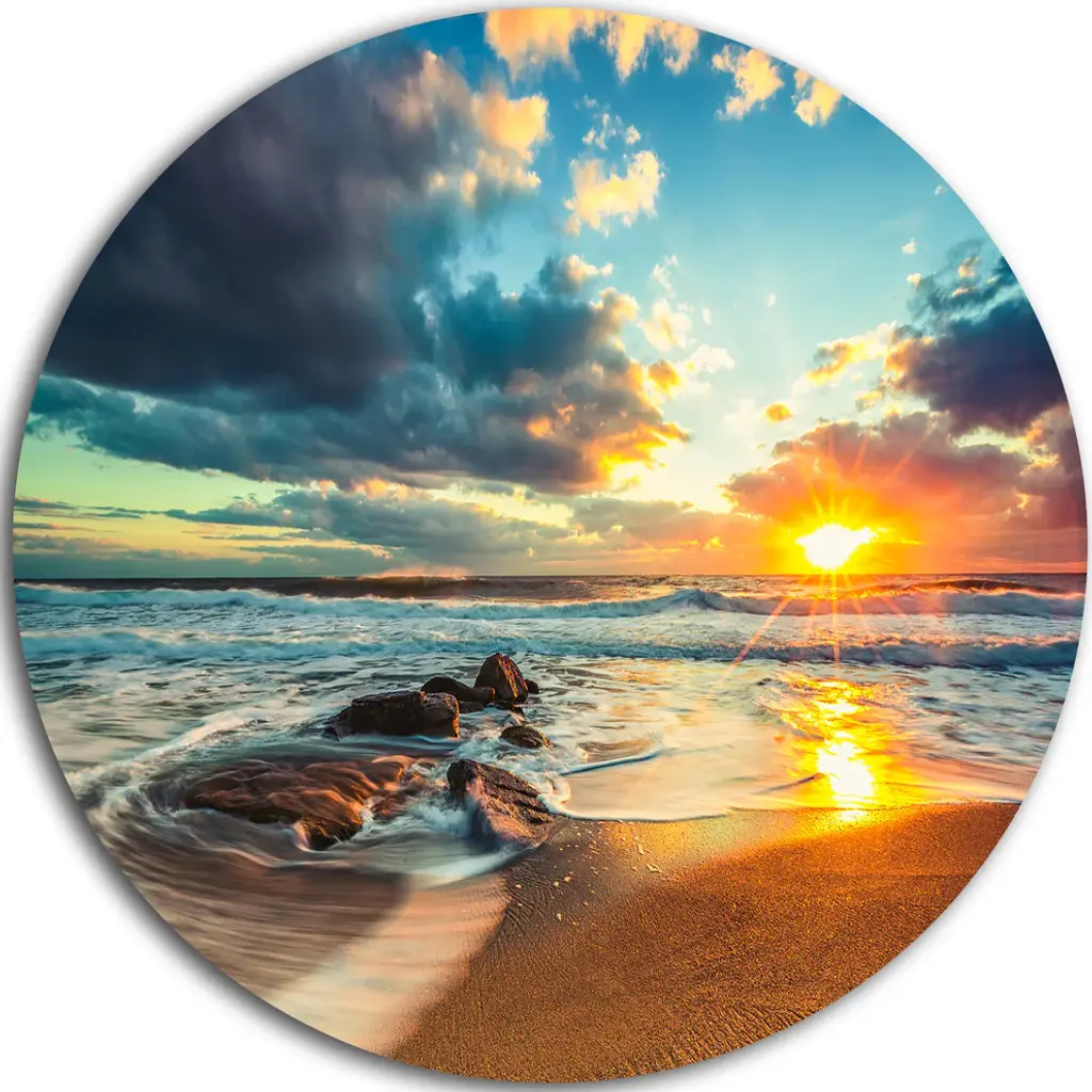 Sunrise And Shining Waves In Sea, Seashore Disc Metal Wall Art, 23"