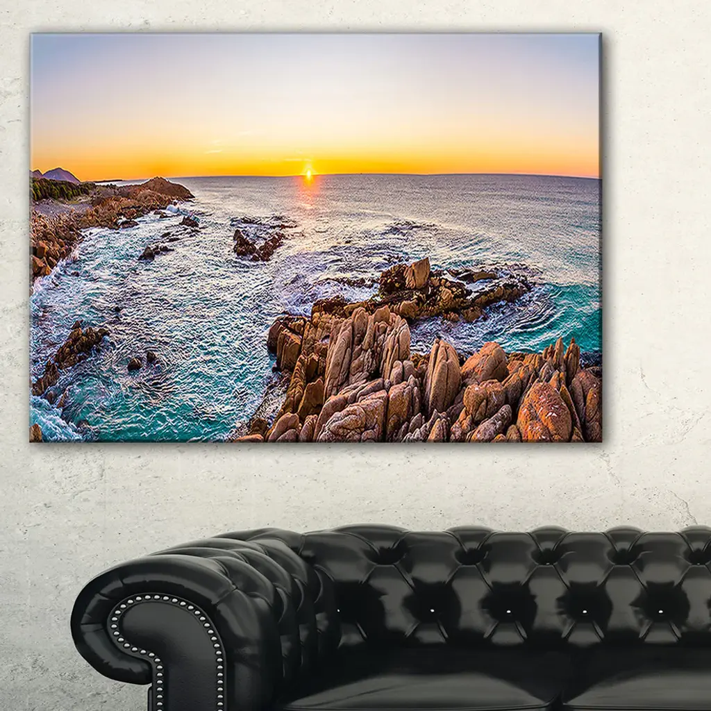 The Sunrise at Freycinet NP Beach canvas art print is sure to make an impression on anyone who sees it. This artwork is gallery wrapped around a 1-inch solid wood frame and arrives carefully packaged and entirely ready to hang on the wall. Design Art only uses the highest resolution and pigments to ensure a crisp colorful print that is never faded or pixelated. This artwork is sure to be a conversation starter in any home or office.