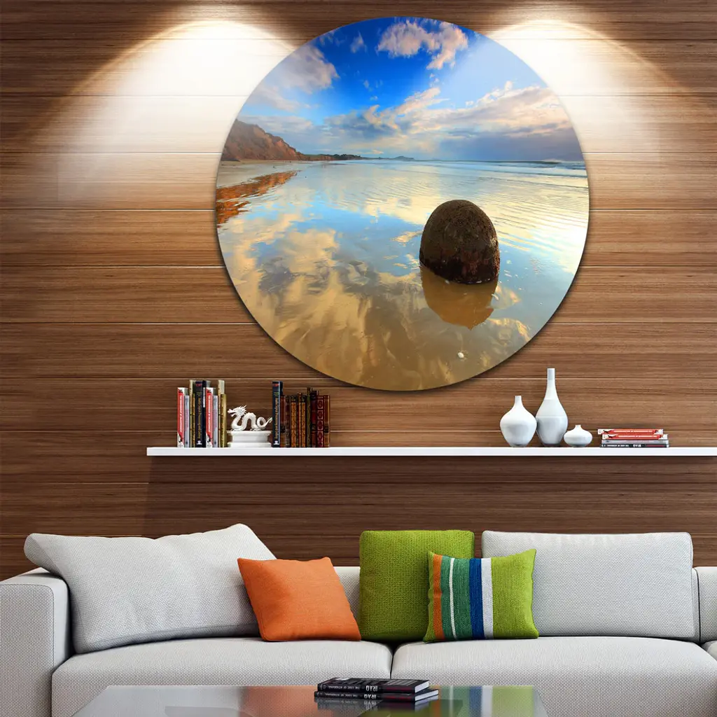 Bring Contemporary Abstraction to your home with this large Circle Metal wall art. This Sunrise at Moeraki Boulders Metal Artwork makes it the focal point of any room or office. - White Gloss Coating ensures colors are extra vibrant with light reflection.- Aluminum grade Sheet Metal with 1 inch mounting frame on the back giving the illusion that the artwork is floating on the wall..- Mounting Brackets are included along with instructions.- High Quality Digital images are created directly into a glossy aluminum panel producing a stunning and captivating print into the glossy finish of the metal.- Water, Fire and Scratch resistant HD Aluminum panels.- Looks better than any photo paper and guaranteed to last at least 20 years- Easy to clean with a microfiber cloth. Colors are far superior to regular Canvas Art. - Easy to Hang