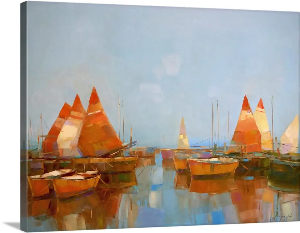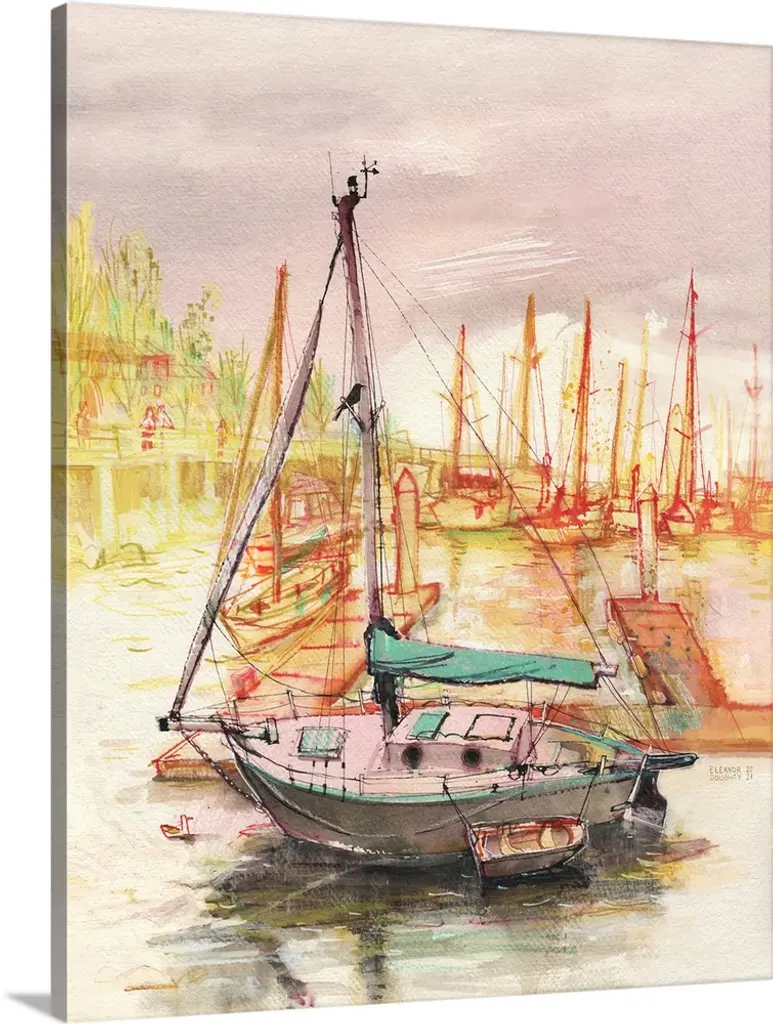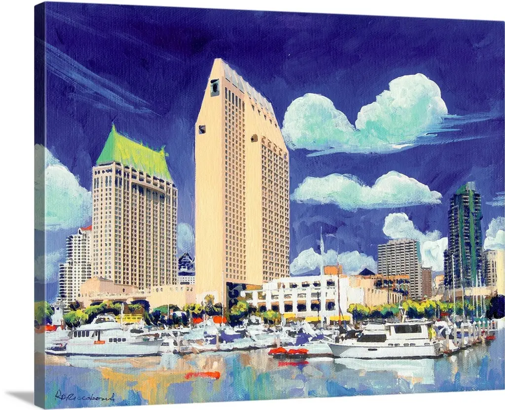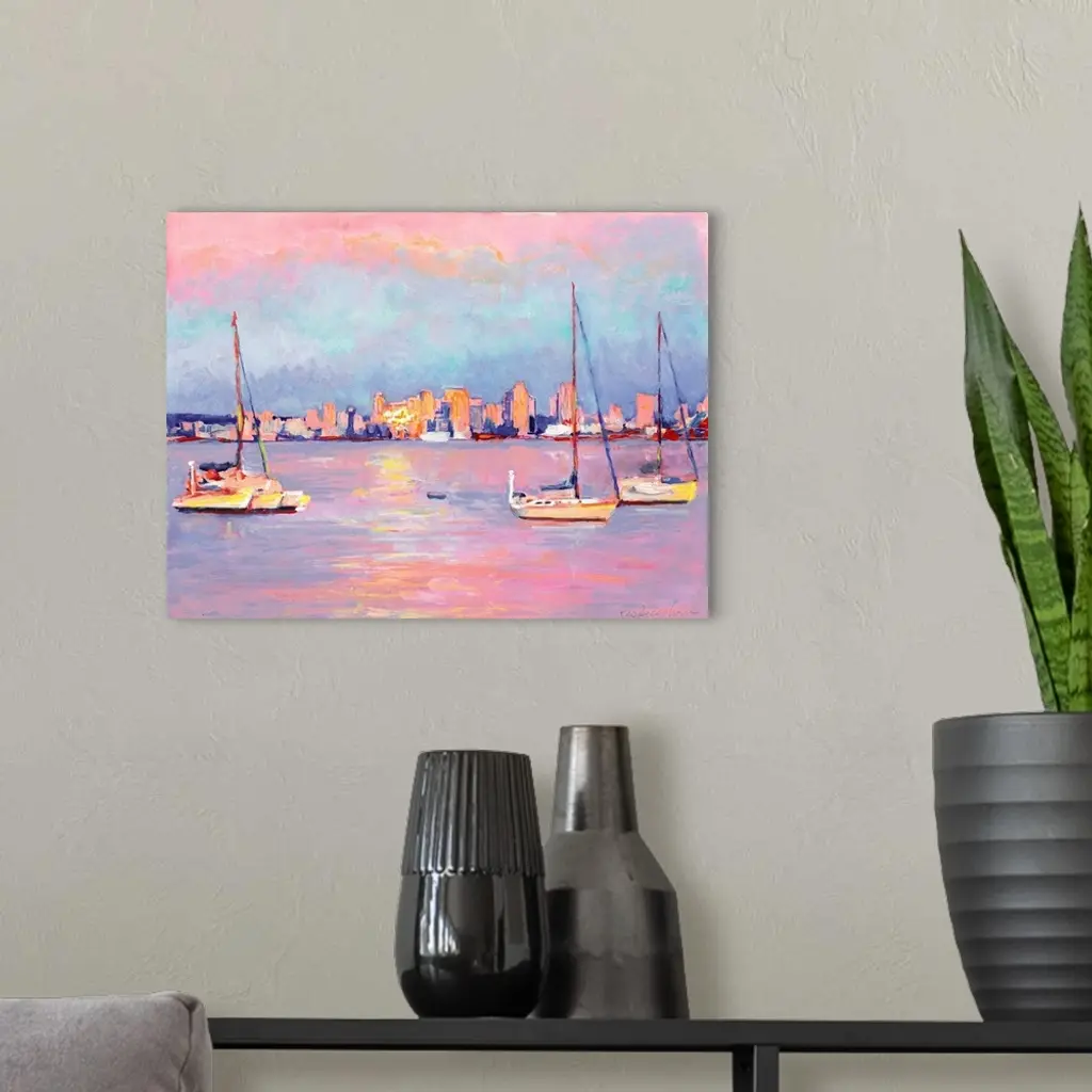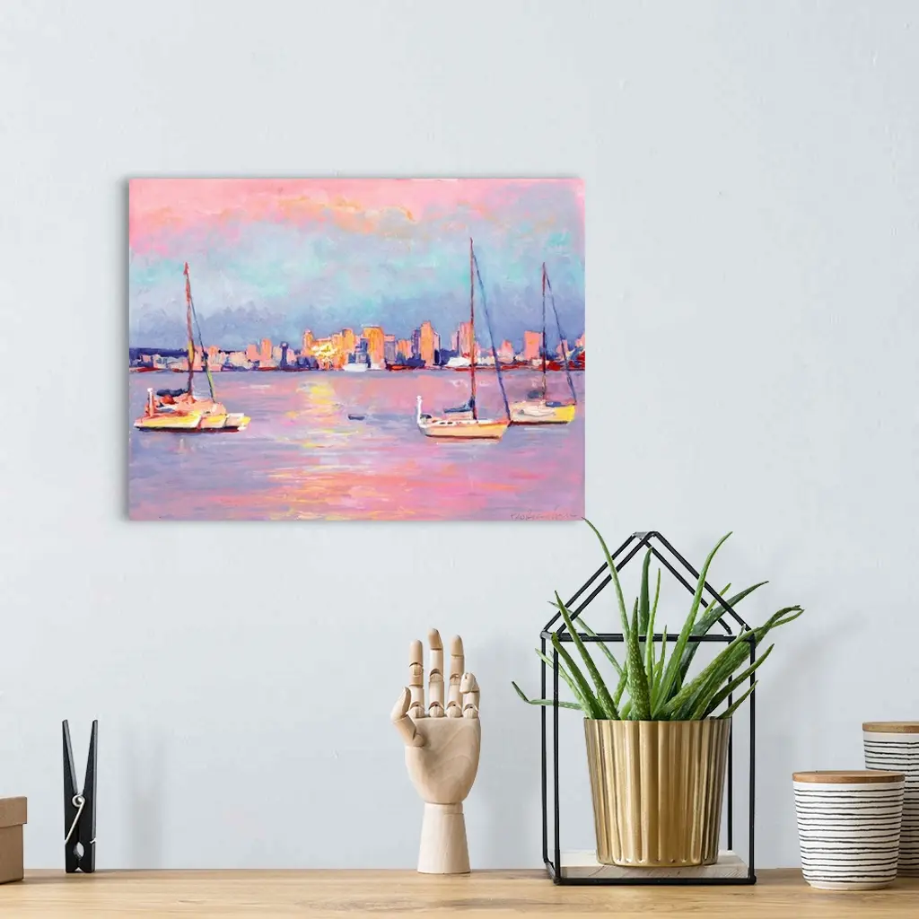 Sunrise from Shelter Island, San Diego Bay, acrylic painting by RD Riccoboni. Warm pink, orange and cool blue tones against the water in the harbor and on the boats, in the background the skyline of the city as the sun reflects back across the water off one of the buildings.