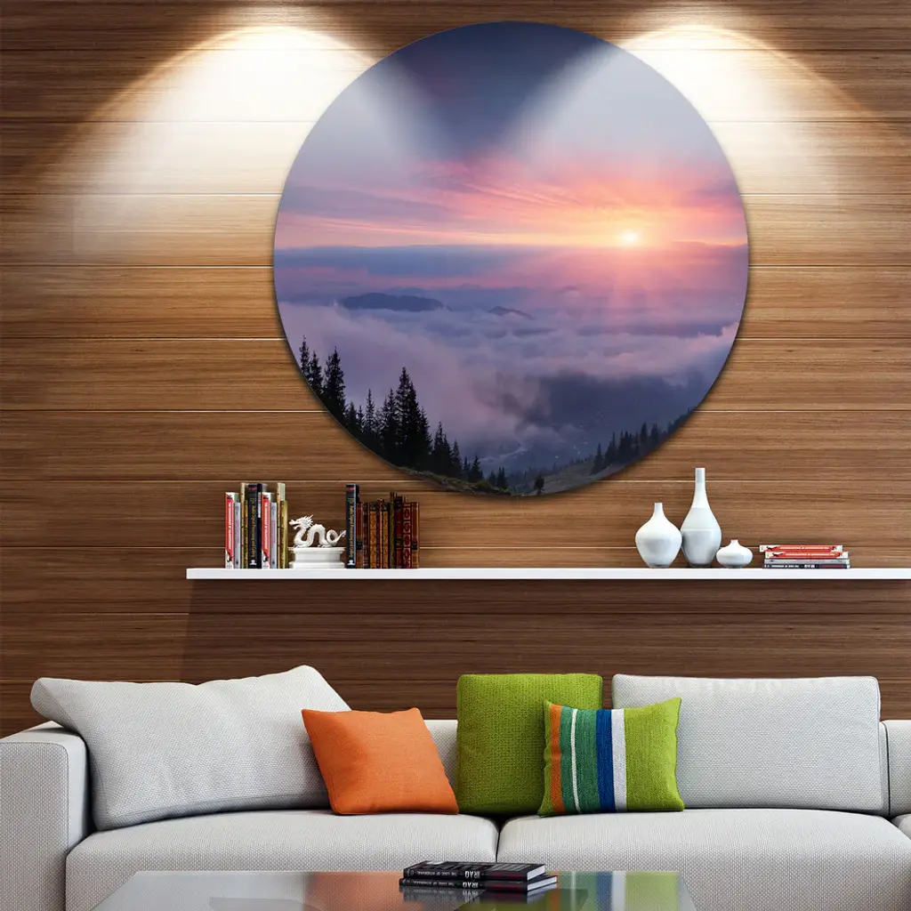 Sunrise In Purple Sky Over Mountains, Landscape Round Wall Art, 36"