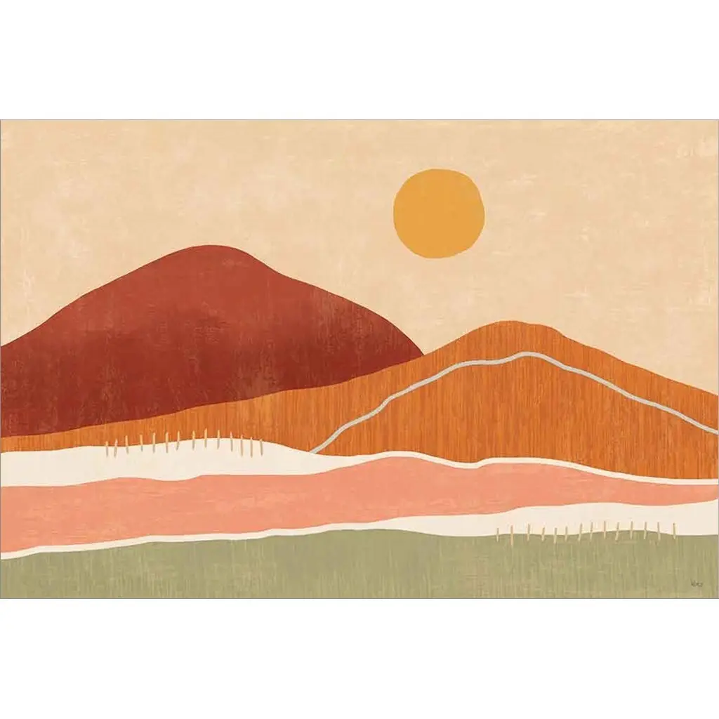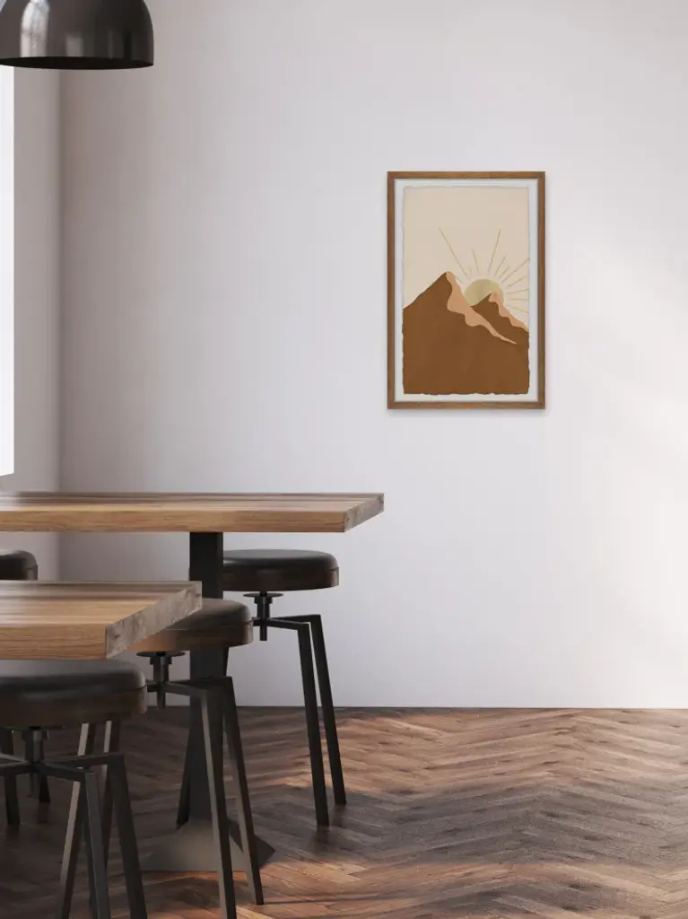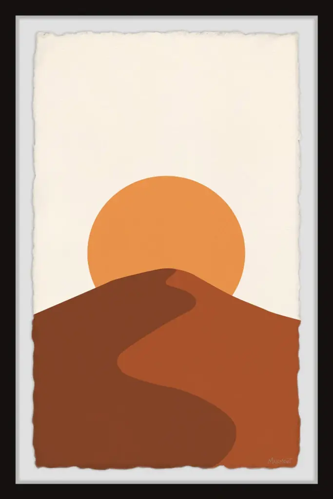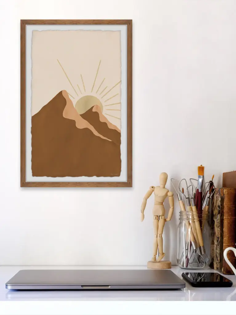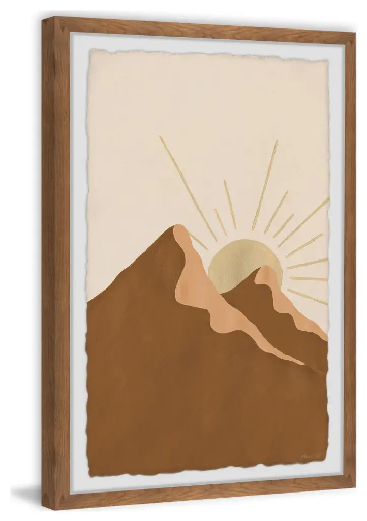 Great for bohemian chic spaces, this acrylic painting print features two massive mountains and the shining sun peeking out of the mountaintop. Proudly printed in the USA, this piece is printed on high quality archive paper and professionally hand-framed. With wall-mounting hooks included, this artful accent is ready to hang up as soon as it reaches your front door.- Top quality Giclee print on high resolution Archive Paper- Hand cut deckled edges- High quality durable non-warping frame- Finished under shatter resistant plexiglass- Arrives ready to hang- Includes a certificate of authenticity- Printed in the USA
