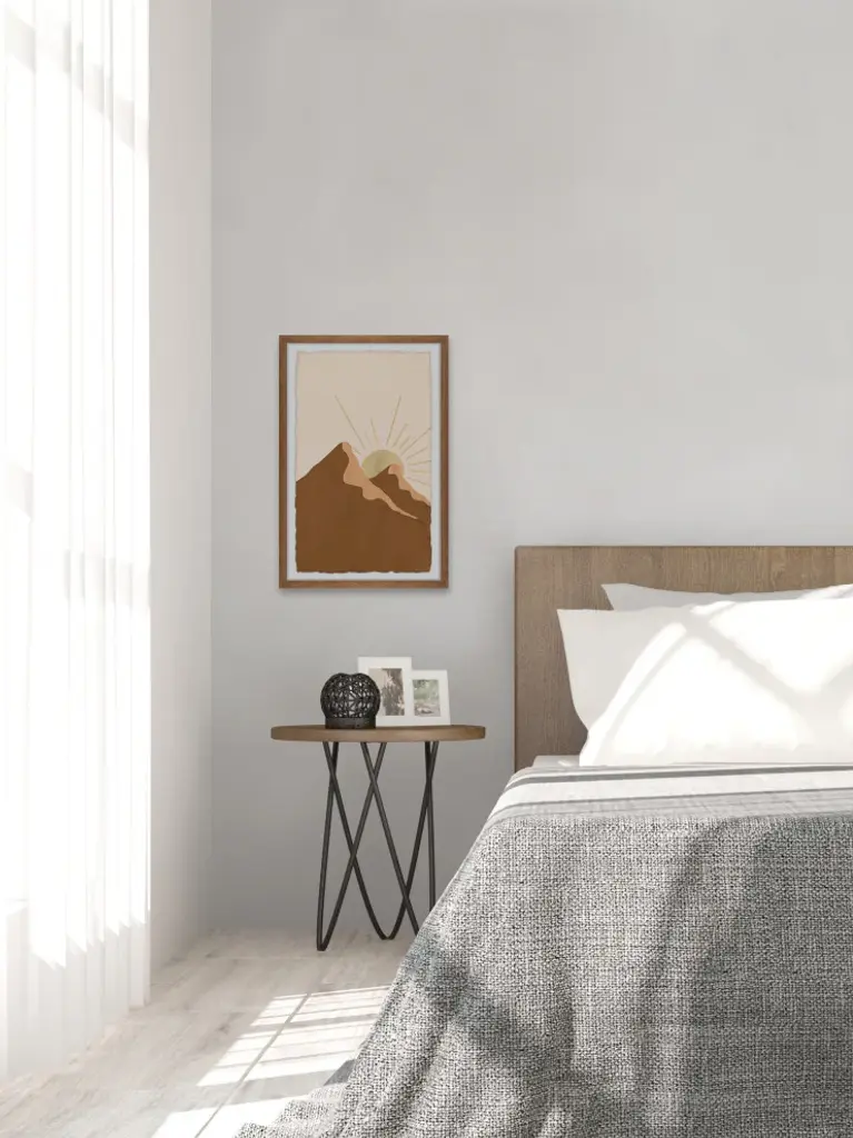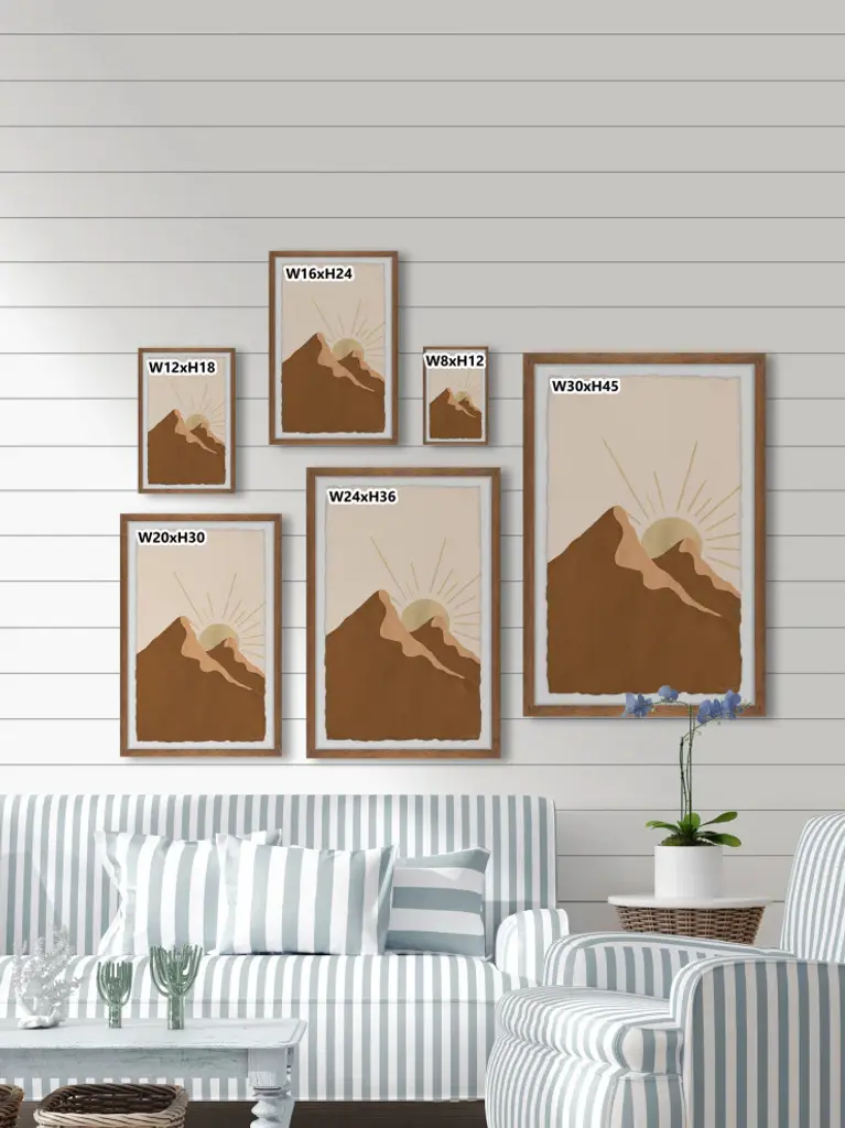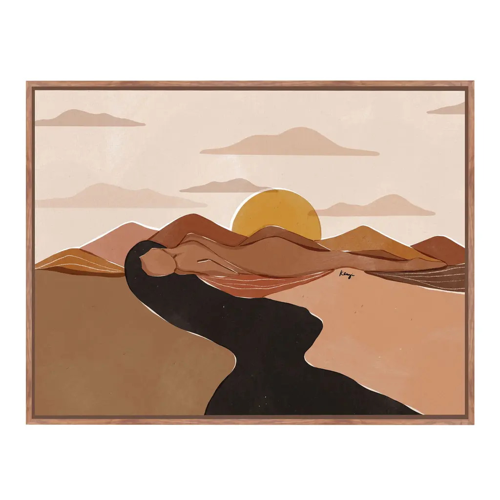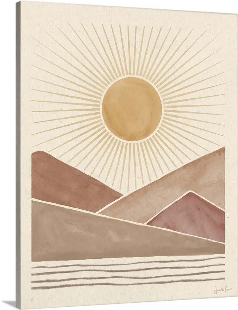 Great for bohemian chic spaces, this acrylic painting print features two massive mountains and the shining sun peeking out of the mountaintop. Proudly printed in the USA, this piece is printed on high quality archive paper and professionally hand-framed. With wall-mounting hooks included, this artful accent is ready to hang up as soon as it reaches your front door.- Top quality Giclee print on high resolution Archive Paper- Hand cut deckled edges- High quality durable non-warping frame- Finished under shatter resistant plexiglass- Arrives ready to hang- Includes a certificate of authenticity- Printed in the USA