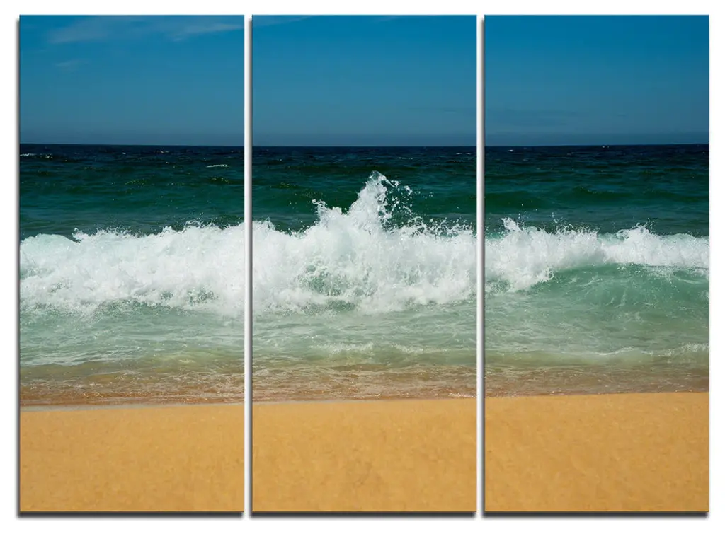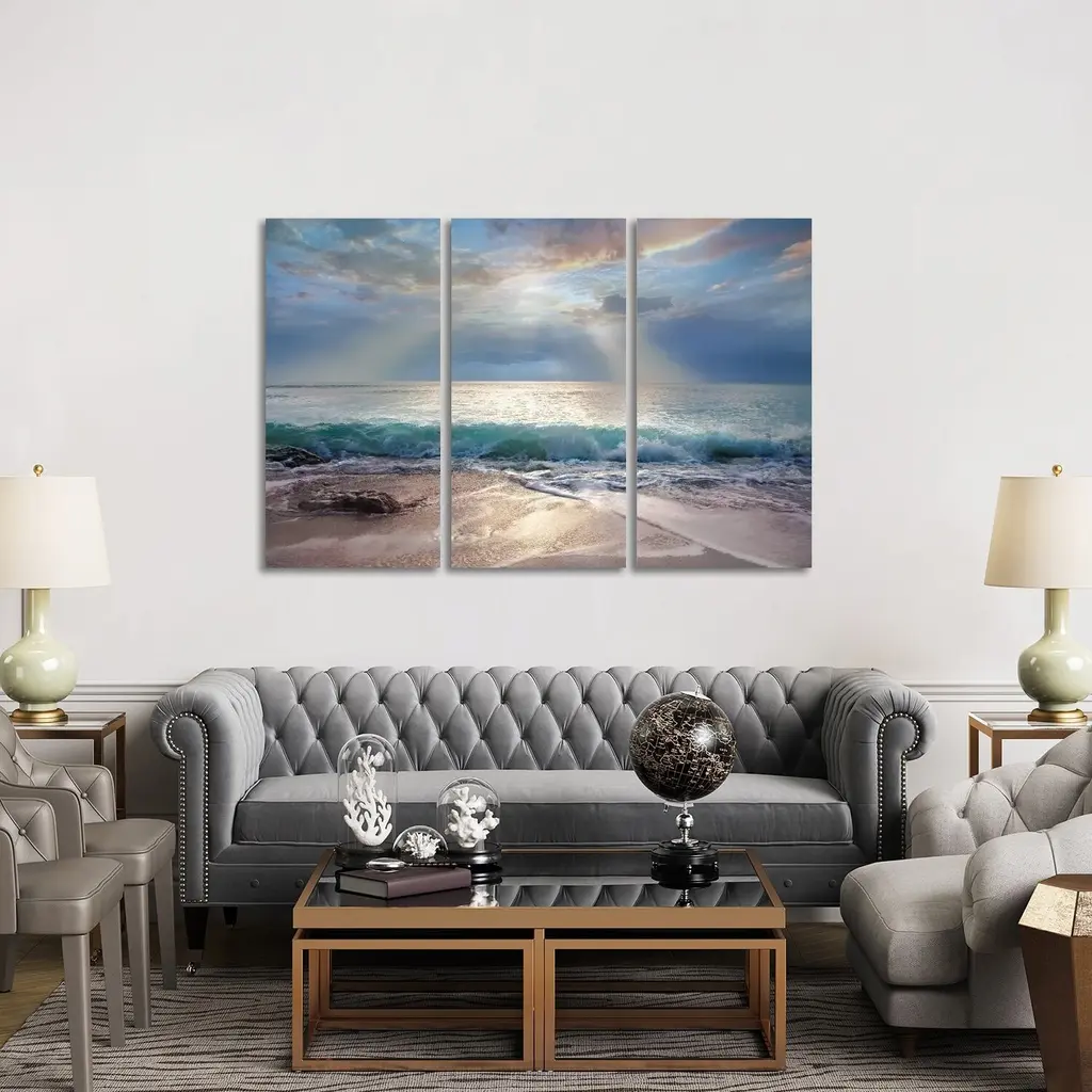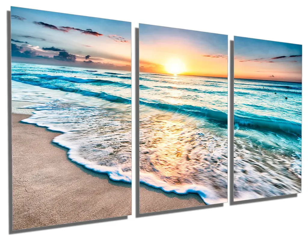 36"œ x 18"œ total size. Ready To Hang! (3 pieces - 12"œ x 18"œ each). 3 Panel Split (Triptych) Metal Print of Sunrise over beach in Cancun. Modern metal wall art for home or office wall decor & interior design. Printed on Luxurious, HD aluminum glossy metal panels. Multi panel art.. HD aluminum panels. Metal print wall art. Includes Shadow Wall Mount on the back.• Aluminum Metal Wall Art• Made in USA• Ready to hang - No assembly required• Shadow mount hardware on the back• 0.045"œ thick HD Aluminum Panels• Scratch resistant, glossy finish• Superb color clarity, luxurious prints• Epson printing process• For indoor or moisture rich environment use• Easy to clean. Gently wipe with microfiber cloth.