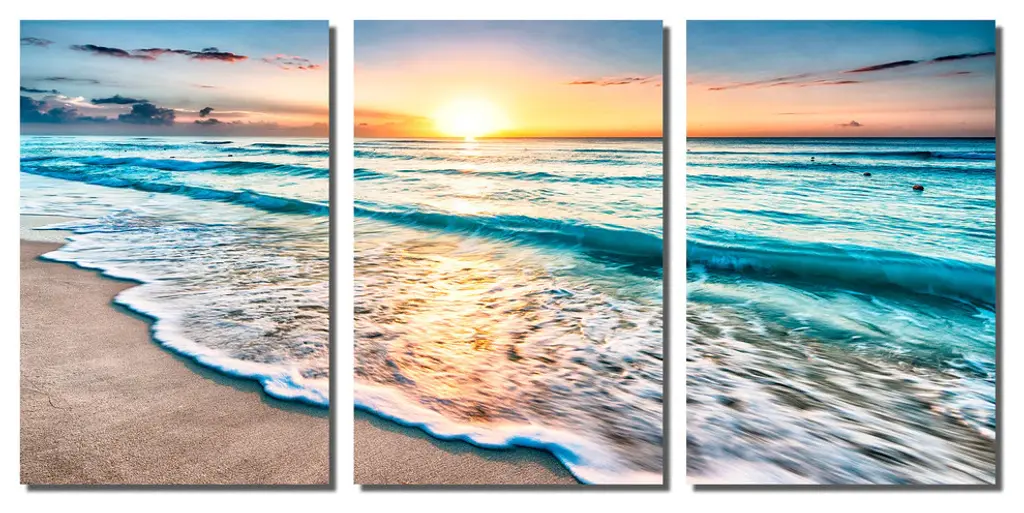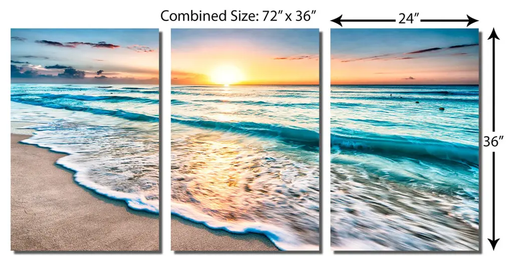 72"œ x 36"œ total size. Ready To Hang! (3 pieces - 24"œ x 36"œ each). 3 Panel Split (Triptych) Metal Print of Sunrise over beach in Cancun. Modern metal wall art for home or office wall decor & interior design. Printed on Luxurious, HD aluminum glossy metal panels. Multi panel art.. HD aluminum panels. Metal print wall art. Includes Shadow Wall Mount on the back.• Aluminum Metal Wall Art• Made in USA• Ready to hang - No assembly required• Shadow mount hardware on the back• 0.045"œ thick HD Aluminum Panels• Scratch resistant, glossy finish• Superb color clarity, luxurious prints• Epson printing process• For indoor or moisture rich environment use• Easy to clean. Gently wipe with microfiber cloth.