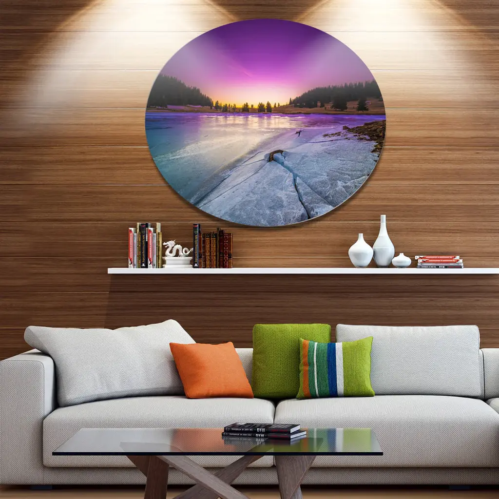 Bring Contemporary Abstraction to your home with this large Circle Metal wall art. This Sunrise over Frozen Lake Metal Artwork makes it the focal point of any room or office. - White Gloss Coating ensures colors are extra vibrant with light reflection.- Aluminum grade Sheet Metal with 1 inch mounting frame on the back giving the illusion that the artwork is floating on the wall..- Mounting Brackets are included along with instructions.- High Quality Digital images are created directly into a glossy aluminum panel producing a stunning and captivating print into the glossy finish of the metal.- Water, Fire and Scratch resistant HD Aluminum panels.- Looks better than any photo paper and guaranteed to last at least 20 years- Easy to clean with a microfiber cloth. Colors are far superior to regular Canvas Art. - Easy to Hang