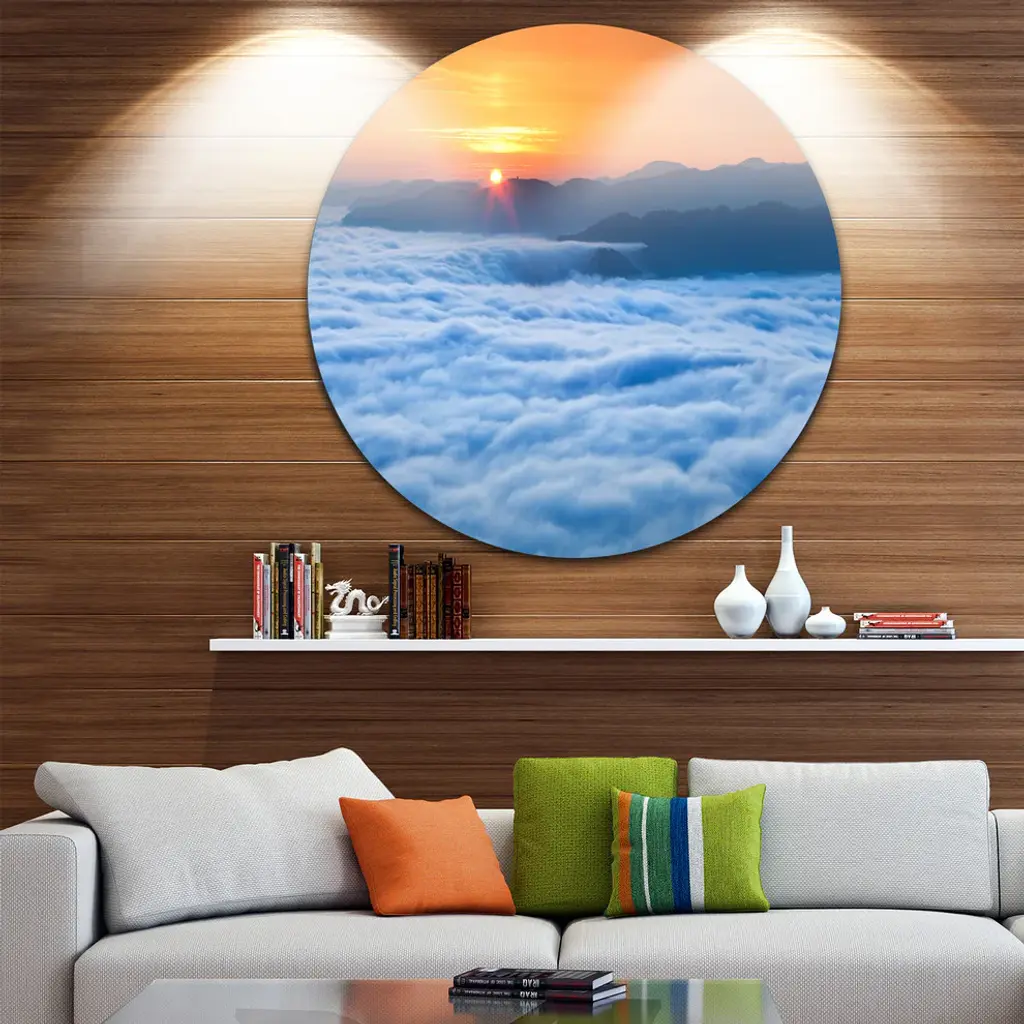 Bring Contemporary Abstraction to your home with this large Circle Metal wall art. This Sunrise Over Misty Sea Waters Metal Artwork makes it the focal point of any room or office. - White Gloss Coating ensures colors are extra vibrant with light reflection.- Aluminum grade Sheet Metal with 1 inch mounting frame on the back giving the illusion that the artwork is floating on the wall..- Mounting Brackets are included along with instructions.- High Quality Digital images are created directly into a glossy aluminum panel producing a stunning and captivating print into the glossy finish of the metal.- Water, Fire and Scratch resistant HD Aluminum panels.- Looks better than any photo paper and guaranteed to last at least 20 years- Easy to clean with a microfiber cloth. Colors are far superior to regular Canvas Art. - Easy to Hang