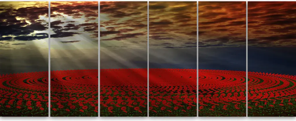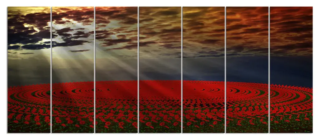 Bring contemporary abstraction to your home with this large 36W x 28H Metal Wall Art. This Sunrise over Rows of Tulips Metal Artwork makes it the focal point of any room or office. - White gloss coating ensures colors are extra vibrant with light reflection.- Aluminum grade sheet metal with 1-inch mounting frame on the back giving the illusion that the artwork is floating on the wall.- Mounting brackets are included along with instructions.- High quality digital images are created directly into a glossy aluminum panel producing a stunning and captivating print into the glossy finish of the metal.- Water, fire and scratch resistant HD aluminum panels.- Looks better than any photo paper and guaranteed to last at least 20 years- Easy to clean with a microfiber cloth. Colors are far superior to regular canvas art. - Easy to hang