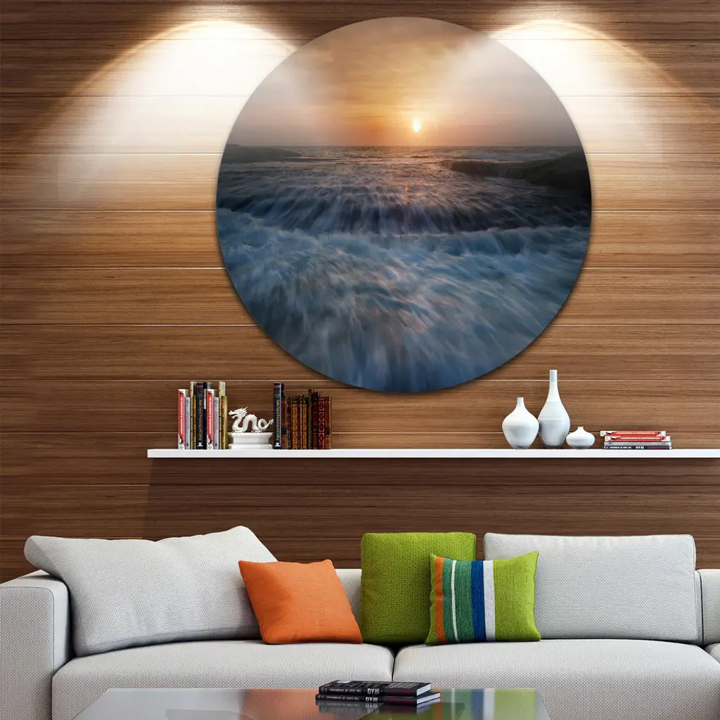 Sunrise Over Rushing White Waves, Beach Disc Metal Wall Art, 36"