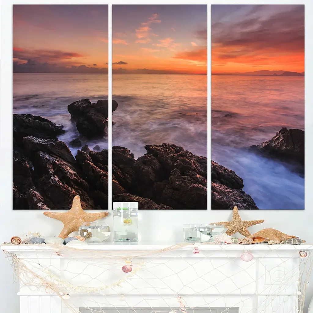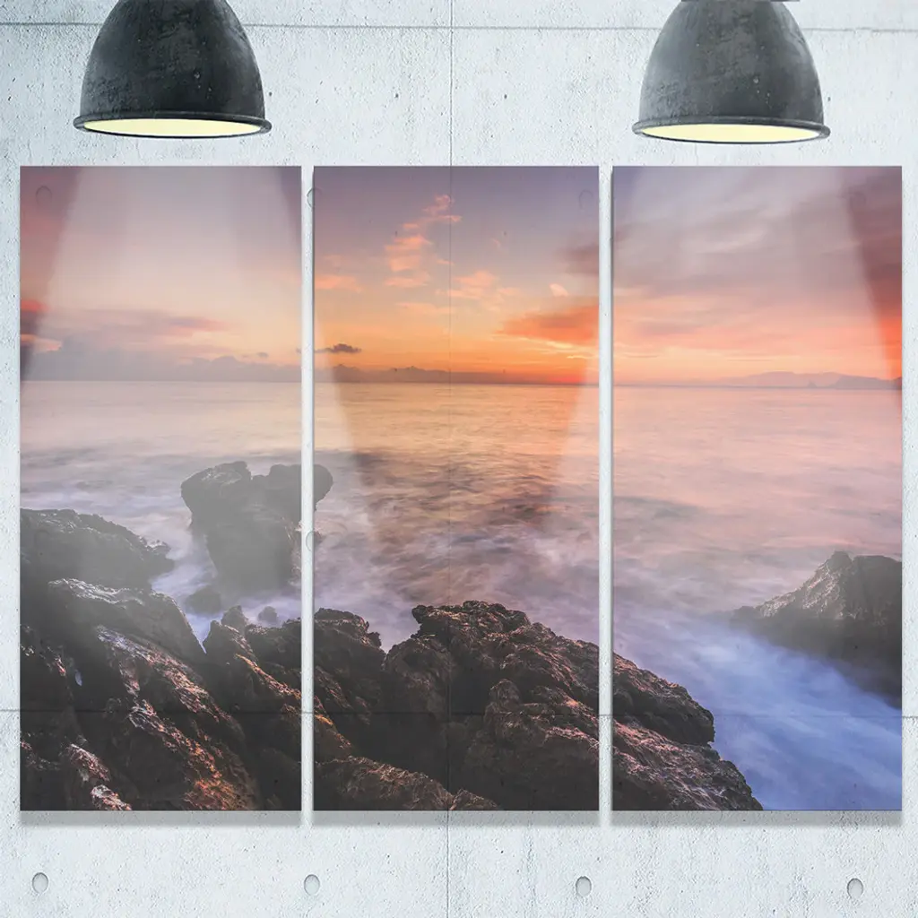 "Sunrise Over The Coast Of Sicily" Beach Metal Wall Art, 3 Panels, 36"x28"