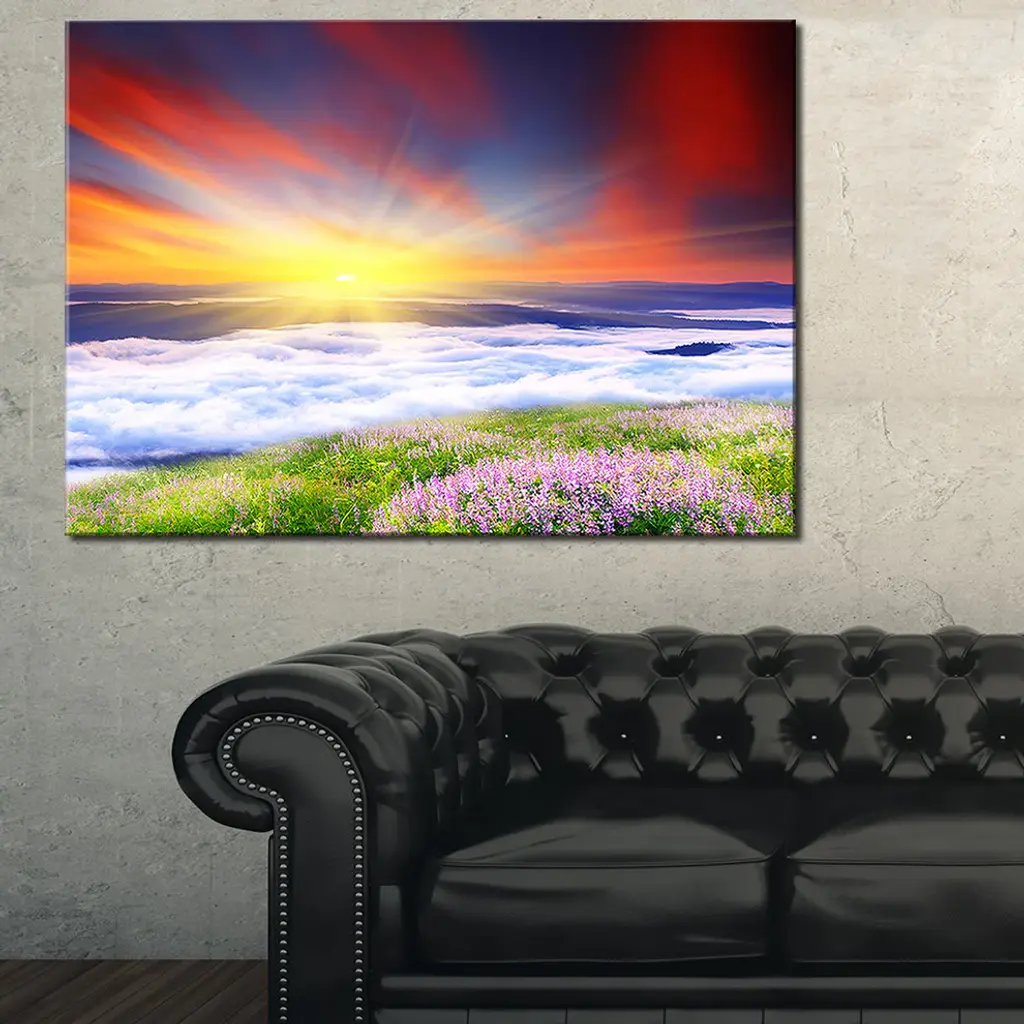 The Sunrise with Blooming Flowers canvas art print is sure to make an impression on anyone who sees it. This artwork is gallery wrapped around a 1-inch solid wood frame and arrives carefully packaged and entirely ready to hang on the wall. Design Art only uses the highest resolution and pigments to ensure a crisp colorful print that is never faded or pixelated. This artwork is sure to be a conversation starter in any home or office.
