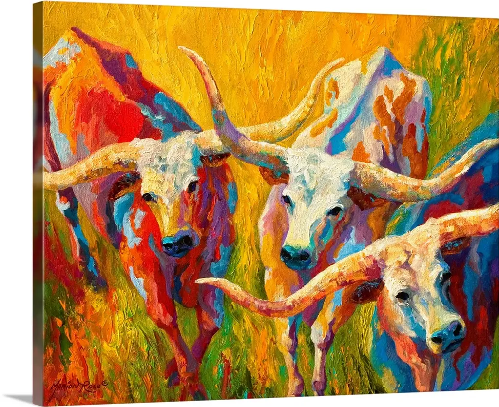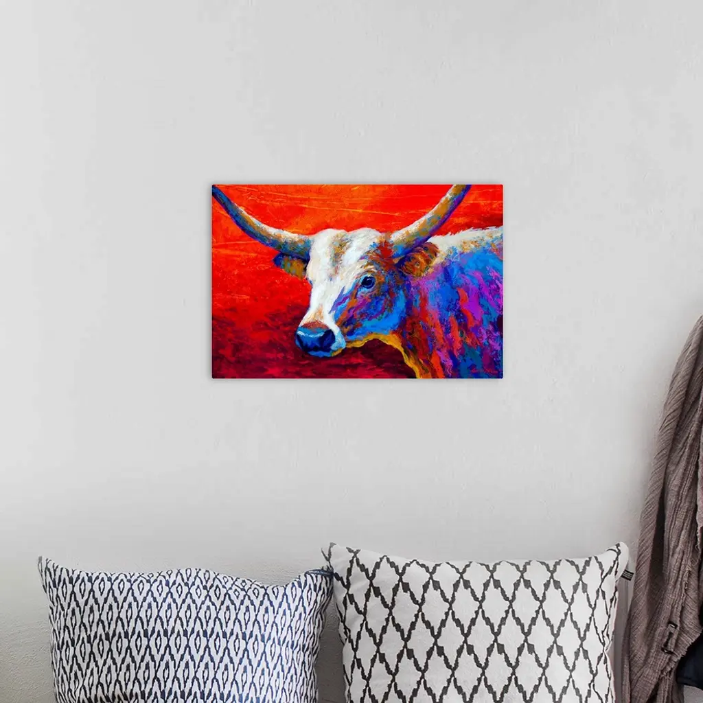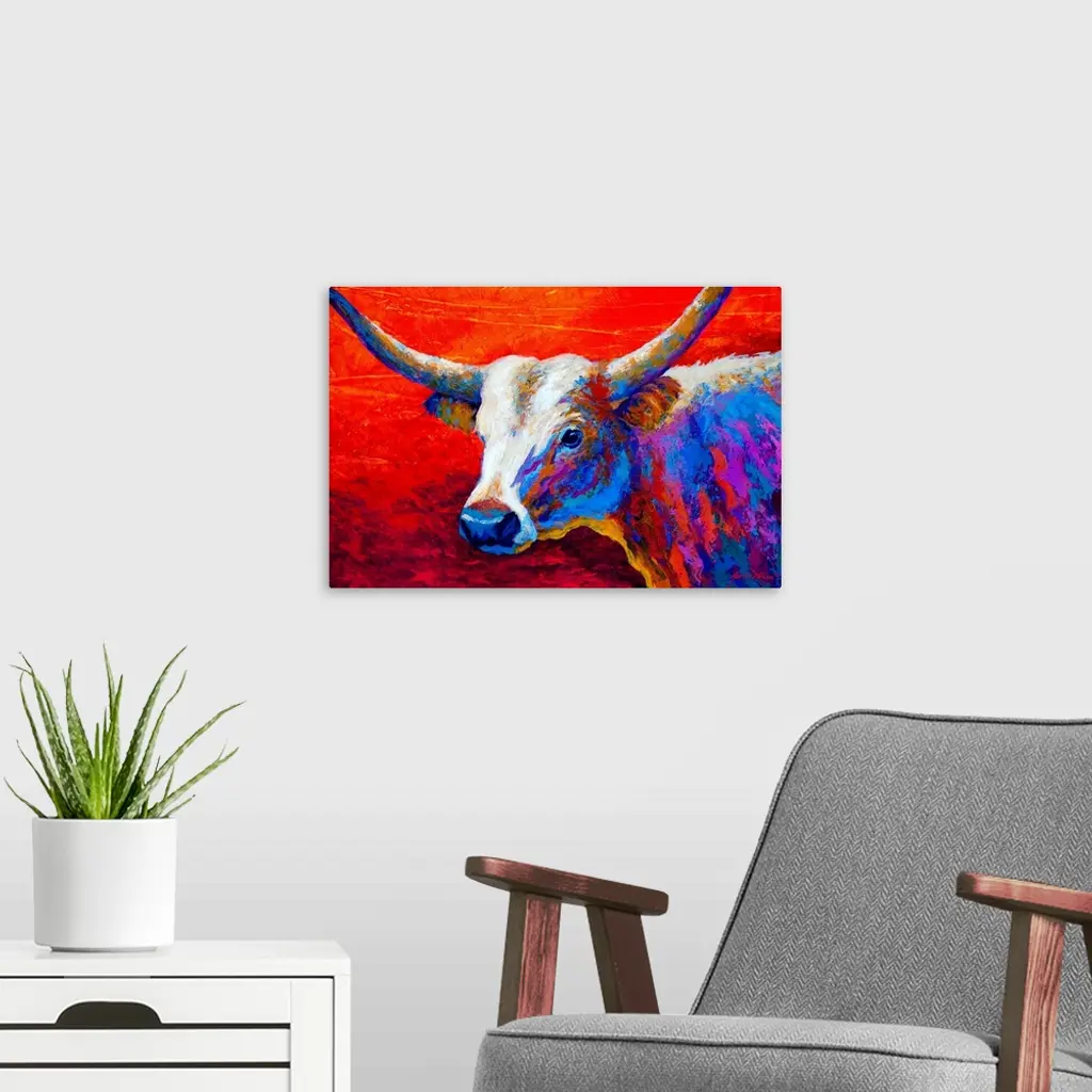 Contemporary art painting of a longhorn cow in brilliant colors on a red sunset background.