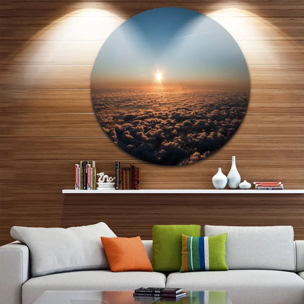 Bring Contemporary Abstraction to your home with this large Circle Metal wall art. This Sunset above the Dark Clouds Metal Artwork makes it the focal point of any room or office. - White Gloss Coating ensures colors are extra vibrant with light reflection.- Aluminum grade Sheet Metal with 1 inch mounting frame on the back giving the illusion that the artwork is floating on the wall..- Mounting Brackets are included along with instructions.- High Quality Digital images are created directly into a glossy aluminum panel producing a stunning and captivating print into the glossy finish of the metal.- Water, Fire and Scratch resistant HD Aluminum panels.- Looks better than any photo paper and guaranteed to last at least 20 years- Easy to clean with a microfiber cloth. Colors are far superior to regular Canvas Art. - Easy to Hang