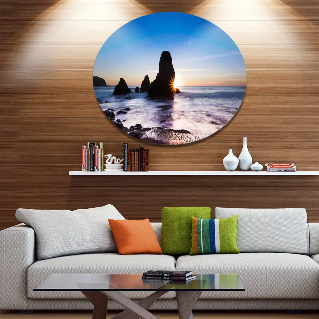 Bring Contemporary Abstraction to your home with this large Circle Metal wall art. This Sunset at Rodeo Beach Panorama Metal Artwork makes it the focal point of any room or office. - White Gloss Coating ensures colors are extra vibrant with light reflection.- Aluminum grade Sheet Metal with 1 inch mounting frame on the back giving the illusion that the artwork is floating on the wall..- Mounting Brackets are included along with instructions.- High Quality Digital images are created directly into a glossy aluminum panel producing a stunning and captivating print into the glossy finish of the metal.- Water, Fire and Scratch resistant HD Aluminum panels.- Looks better than any photo paper and guaranteed to last at least 20 years- Easy to clean with a microfiber cloth. Colors are far superior to regular Canvas Art. - Easy to Hang