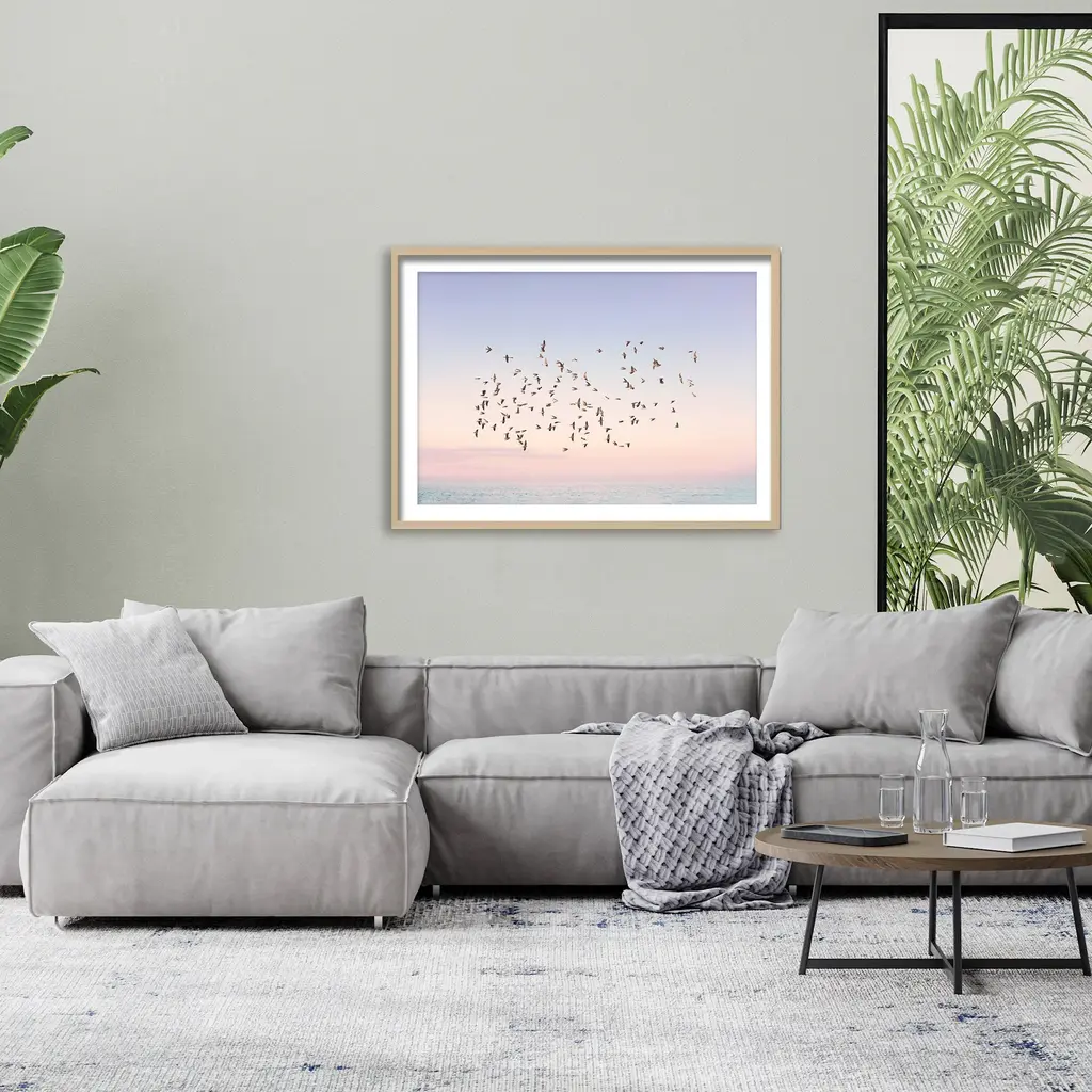 Infuse any space with the essence of this coastal framed print wall art titled "Sunset Flight" by Kathrin Pienaar. The piece features a flock of migrating birds flying over calm ocean waters during sunset that will complement any modern space. Handcrafted in Chattanooga, Tennessee, by Ready2HangArt using a locally sourced artist print, finished with a rear hanger for simple installation.