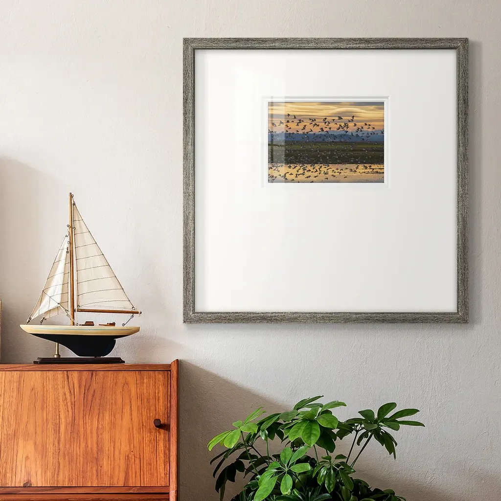 Sunset FlightPremium Framed Print A framed cold pressed paper print featuring superior double matting and quality frame. 2 SIZES AVAILABLE 16''X16''' - Overall Size 20''X20''' - Overall Size Each piece is made to order. Each piece comes with hanging hardware. Made in the USA Ready to Hang Giclee Paper Print Plexiglass Beveled Matt Board Double Matte Board