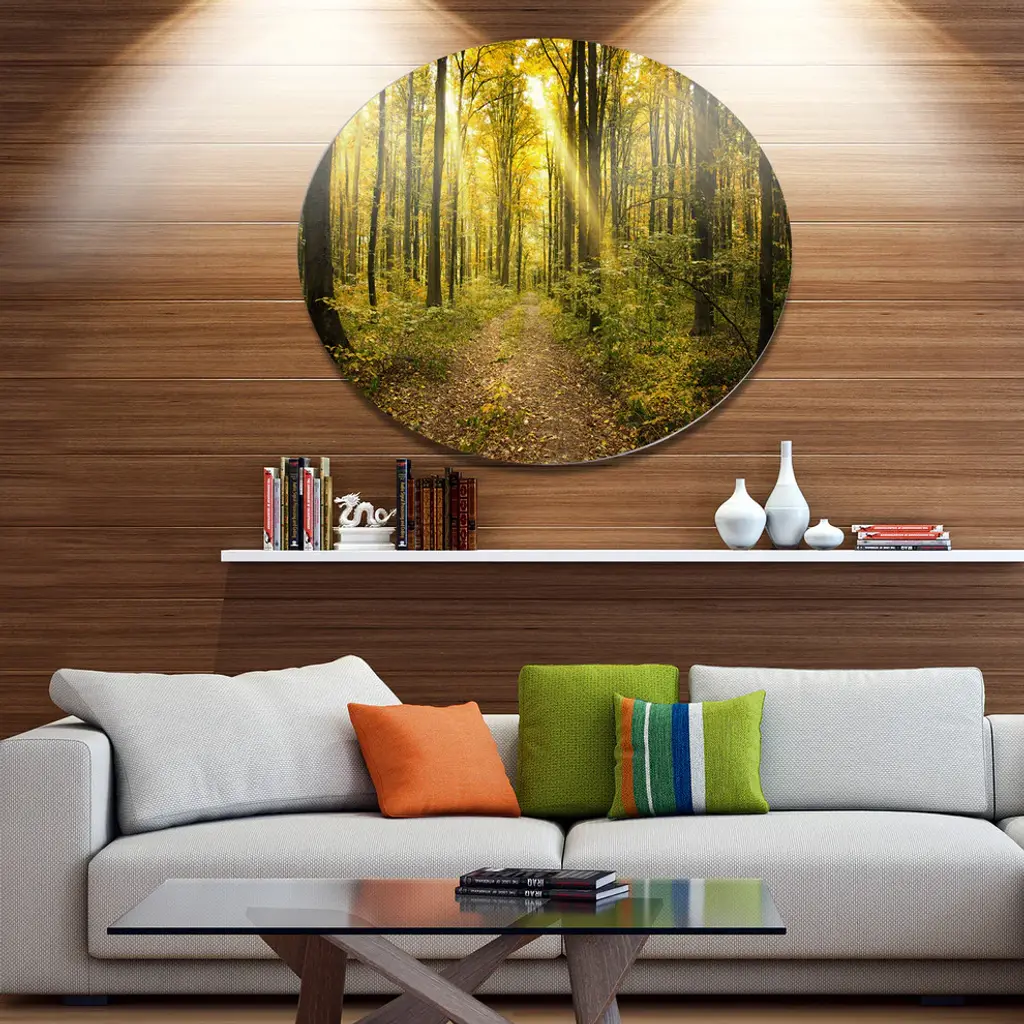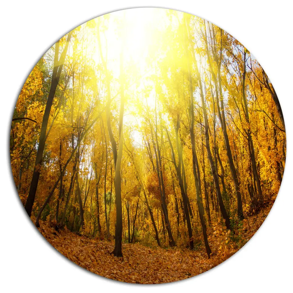 Sunset In Green Autumn Forest, Modern Forest Disc Metal Artwork, 11"