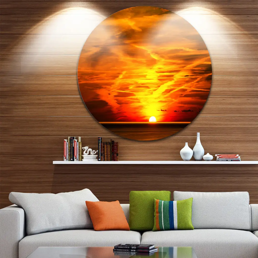 Bring Contemporary Abstraction to your home with this large Circle Metal wall art. This Sunset in Liguria Italy Metal Artwork makes it the focal point of any room or office. - White Gloss Coating ensures colors are extra vibrant with light reflection.- Aluminum grade Sheet Metal with 1 inch mounting frame on the back giving the illusion that the artwork is floating on the wall..- Mounting Brackets are included along with instructions.- High Quality Digital images are created directly into a glossy aluminum panel producing a stunning and captivating print into the glossy finish of the metal.- Water, Fire and Scratch resistant HD Aluminum panels.- Looks better than any photo paper and guaranteed to last at least 20 years- Easy to clean with a microfiber cloth. Colors are far superior to regular Canvas Art. - Easy to Hang