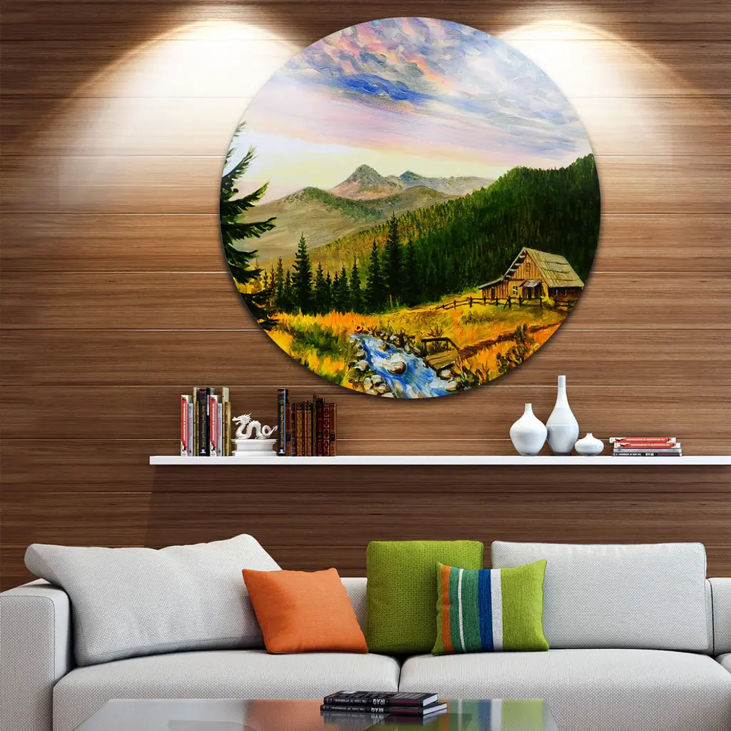 Bring Contemporary Abstraction to your home with this large Circle Metal wall art. This Sunset in Mountains Metal Artwork makes it the focal point of any room or office. - White Gloss Coating ensures colors are extra vibrant with light reflection.- Aluminum grade Sheet Metal with 1 inch mounting frame on the back giving the illusion that the artwork is floating on the wall..- Mounting Brackets are included along with instructions.- High Quality Digital images are created directly into a glossy aluminum panel producing a stunning and captivating print into the glossy finish of the metal.- Water, Fire and Scratch resistant HD Aluminum panels.- Looks better than any photo paper and guaranteed to last at least 20 years- Easy to clean with a microfiber cloth. Colors are far superior to regular Canvas Art. - Easy to Hang