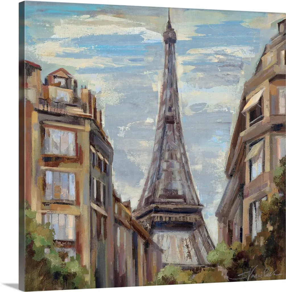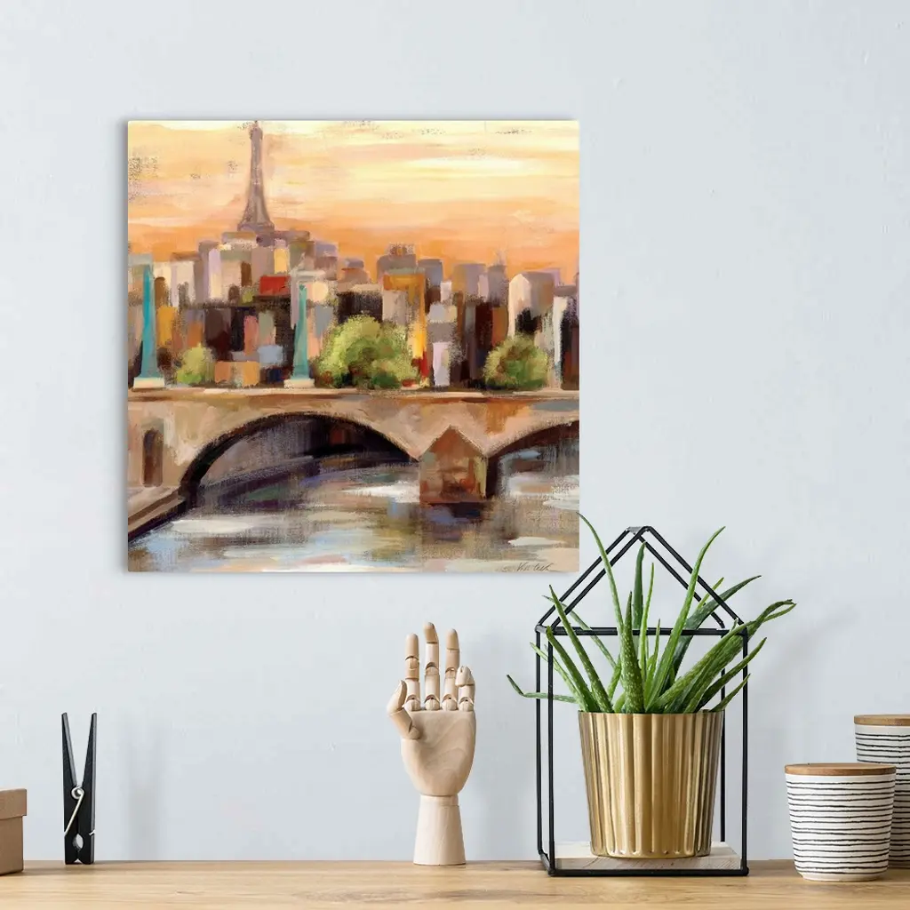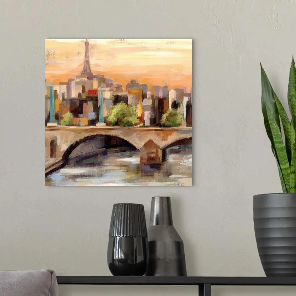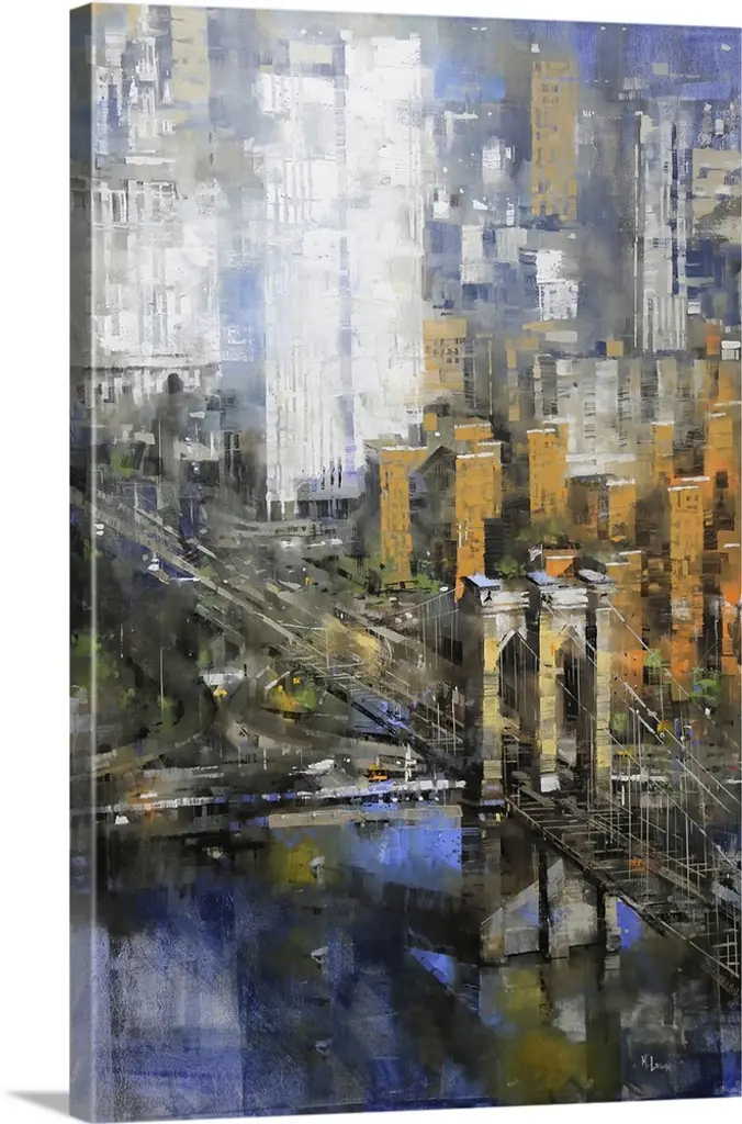 Contemporary painting of a city skyline with a bridge in the foreground.