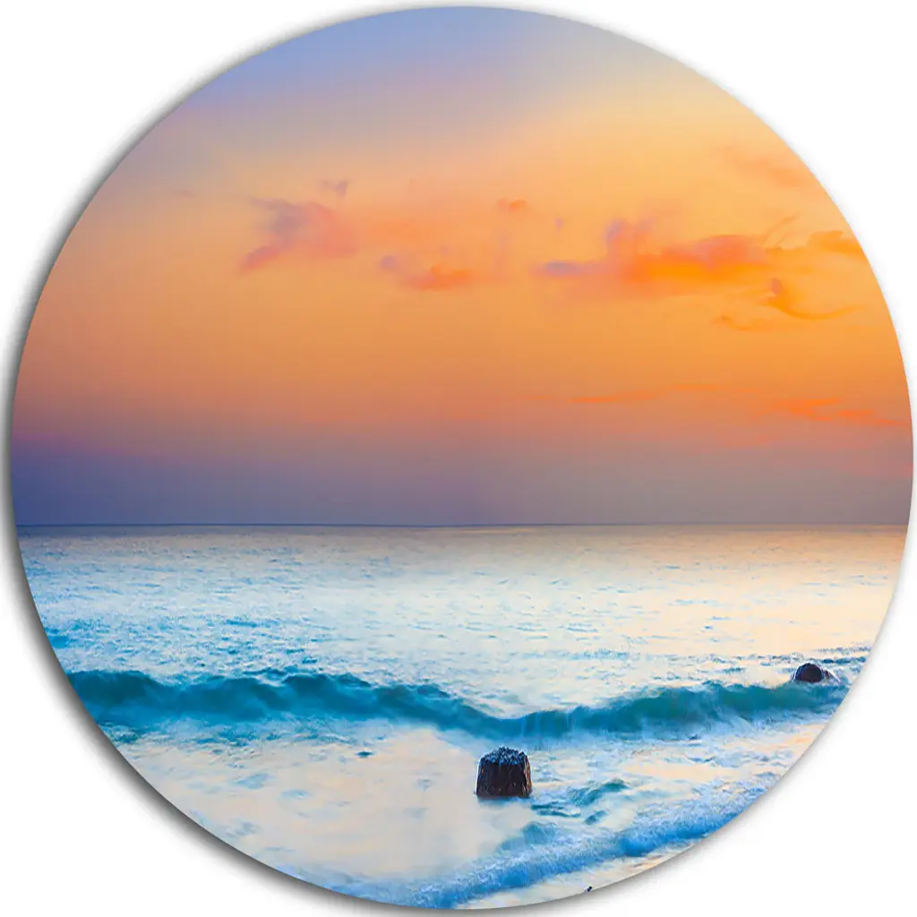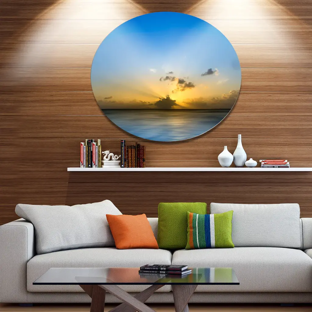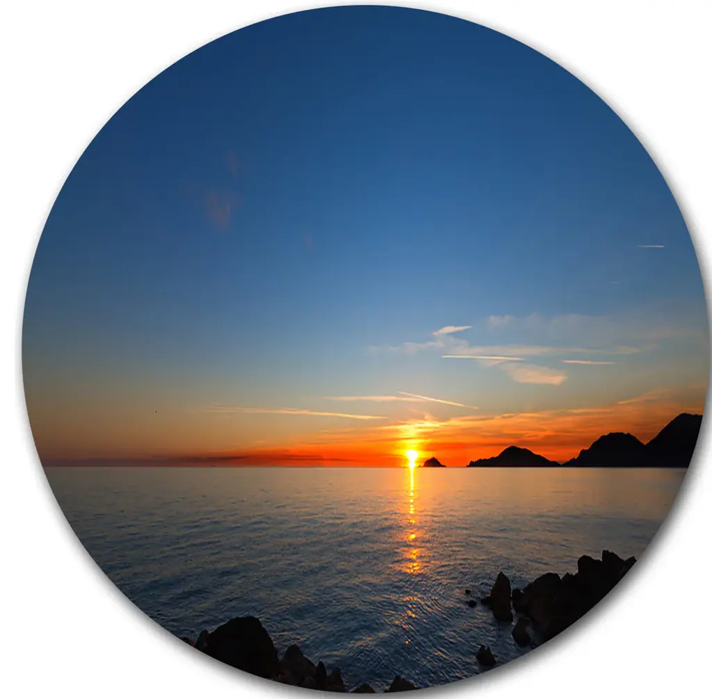 Bring Contemporary Abstraction to your home with this large Circle Metal wall art. This Sunset Lake in South Thailand Metal Artwork makes it the focal point of any room or office. - White Gloss Coating ensures colors are extra vibrant with light reflection.- Aluminum grade Sheet Metal with 1 inch mounting frame on the back giving the illusion that the artwork is floating on the wall..- Mounting Brackets are included along with instructions.- High Quality Digital images are created directly into a glossy aluminum panel producing a stunning and captivating print into the glossy finish of the metal.- Water, Fire and Scratch resistant HD Aluminum panels.- Looks better than any photo paper and guaranteed to last at least 20 years- Easy to clean with a microfiber cloth. Colors are far superior to regular Canvas Art. - Easy to Hang