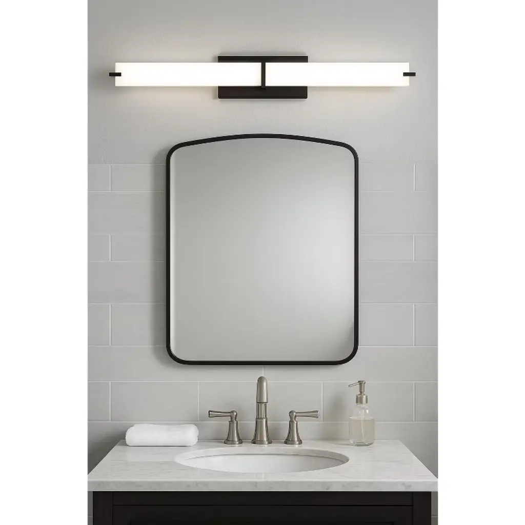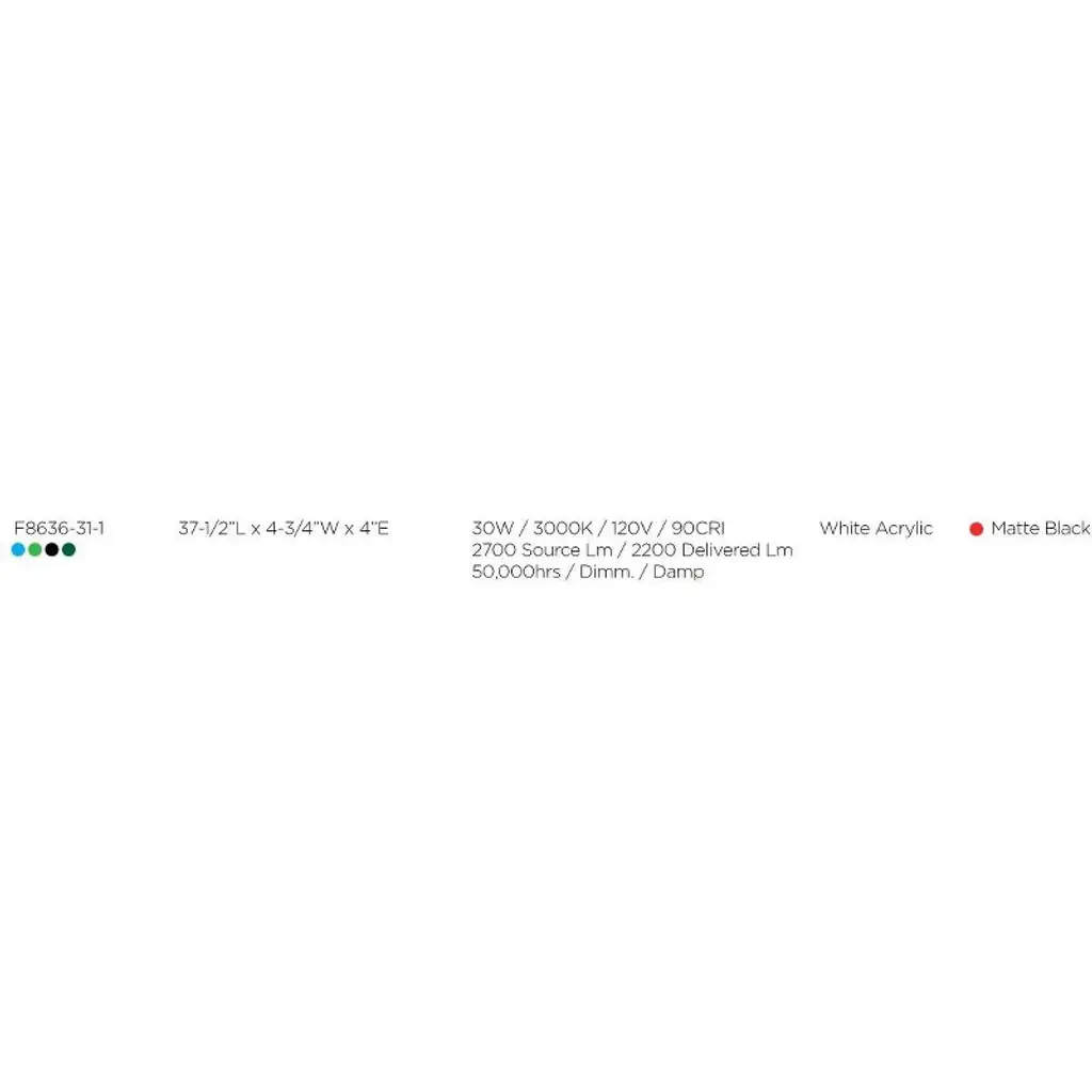 Sunset Lighting 37.5-in 1-Light LED Transitional Vanity Light, Matte Black Base Sleek, 37.5" over-mirror LED bar with a matte black base and white acrylic lens. Warm 3000K light with 90 CRI delivers accurate color, damp-rated reliability, and long 50,000-hour performance—ideal for modern baths. Key Features • Integrated 30W LED; warm 3000K output • High color accuracy: 90 CRI • Brightness: 2700 source lm / 2200 delivered lm • Long life: 50,000 hours • Damp location rated for bathroom use • White acrylic lens with matte black base • Transitional, low-profile design at 37.5" width • 120V hardwired installation Specifications • Dimensions: 37-1/2" L x 4-3/4" W x 4" E • Wattage: 30W • Color Temperature: 3000K • CRI: 90 • Source Lumens: 2700 lm • Delivered Lumens: 2200 lm • Voltage: 120V • Rated Life: 50,000 hrs • Lens/Finish: White Acrylic / Matte Black • Suitable Location: Damp • Light Count: 1 (integrated LED)