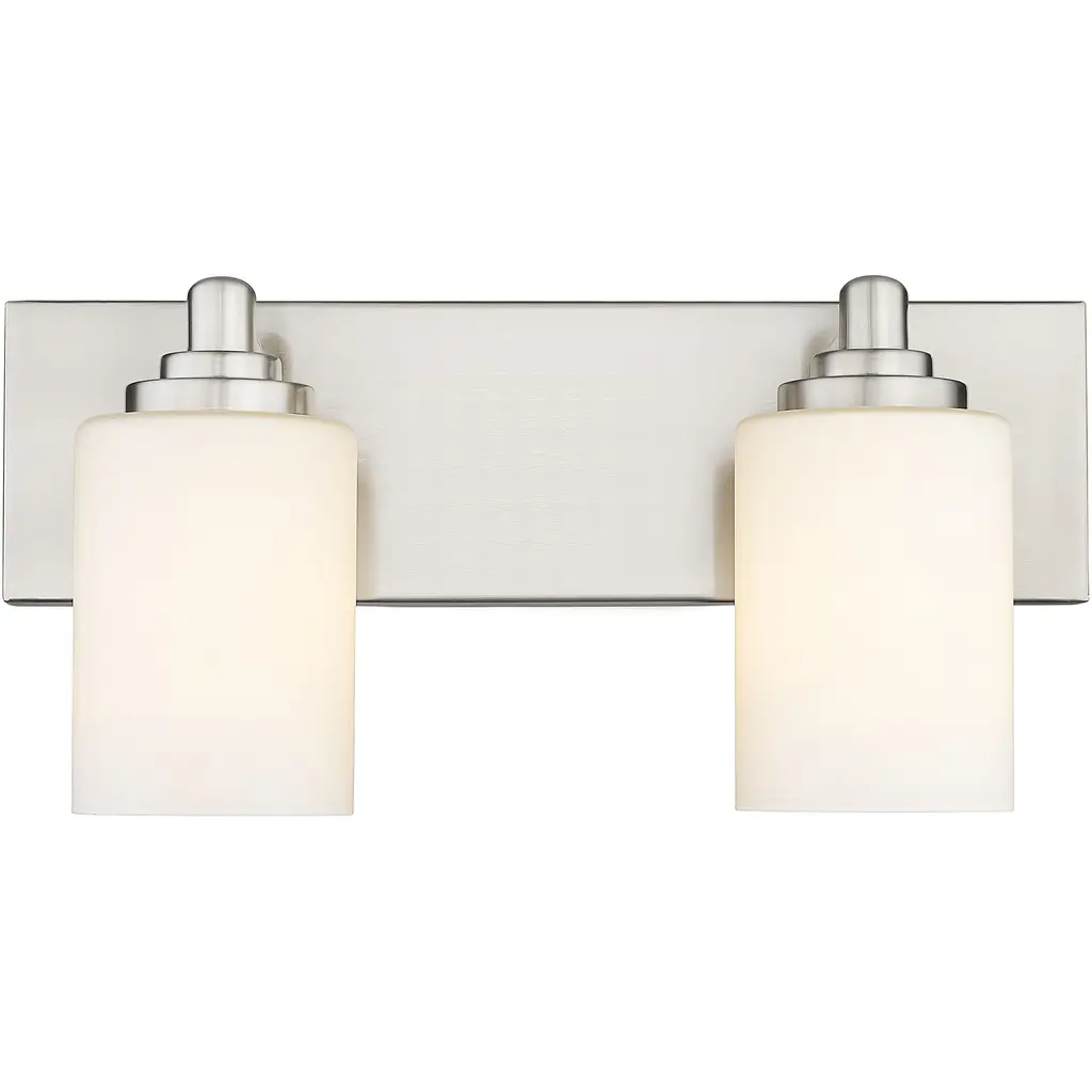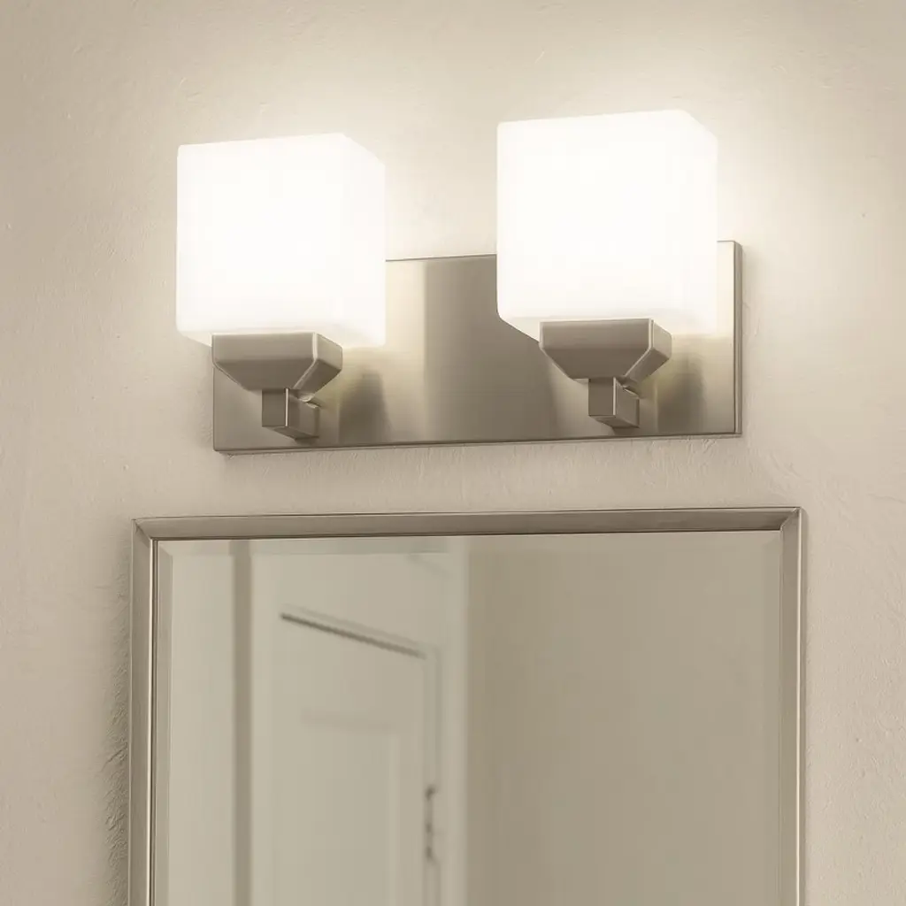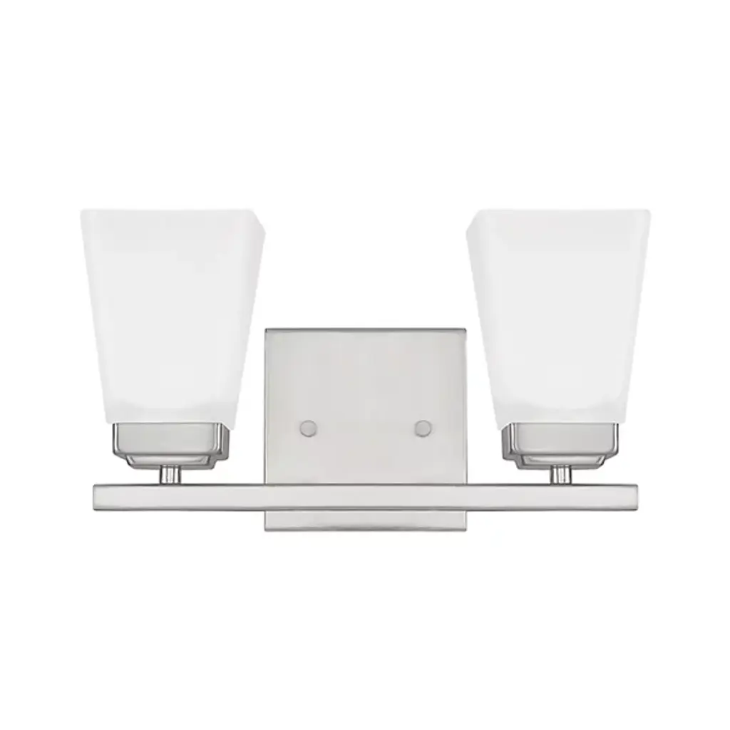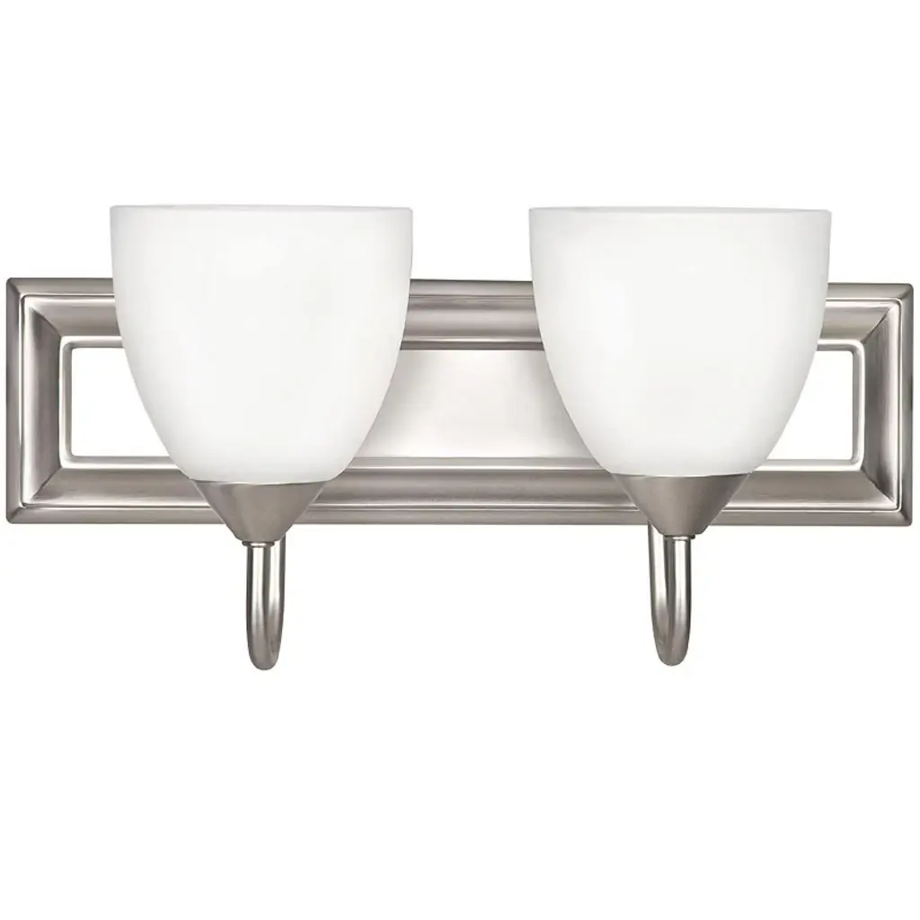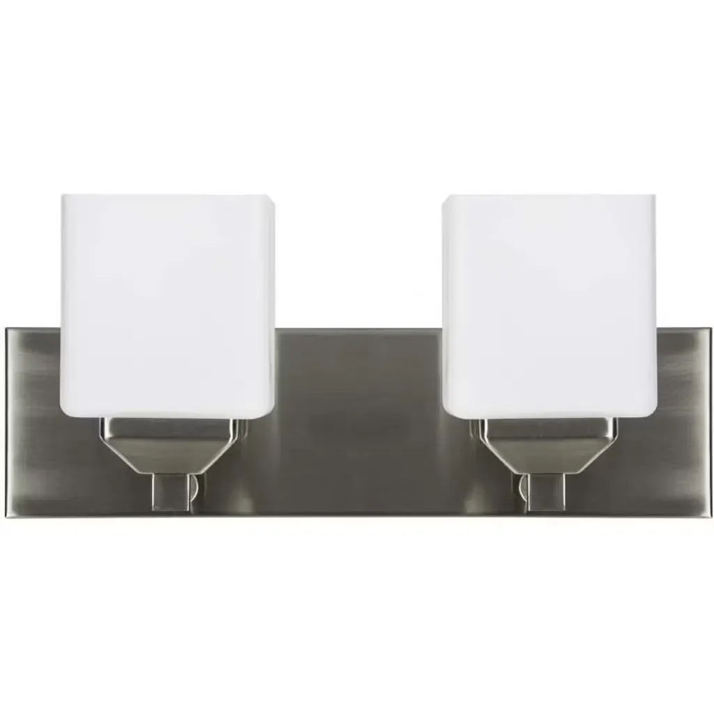 Sunset Lighting LED 2-Light Vanity Light 8W x 2, 3000K, 1040LM, CRI80 A clean, modern 2‑light LED vanity with frosted glass shades and a Bright Satin Nickel look that delivers soft, even illumination. Designed for damp locations, it provides reliable, energy‑saving performance with long LED life for everyday use. Key Features: • 2‑light integrated LED vanity • Frosted glass for diffused, comfortable light • 3000K warm white; 80 CRI • Long 35,000‑hour LED life; non‑dimmable Specifications: • Dimensions: 24" W x 7" H x 6" E • Lamping: 3‑8W LED • CRI: 80 • CCT: 3000K • Life Hours: 35,000 • Glass: Frosted • Dimmable: Non‑Dimmable • Lumens (Source): 2160 • Lumens (Delivered): 1560