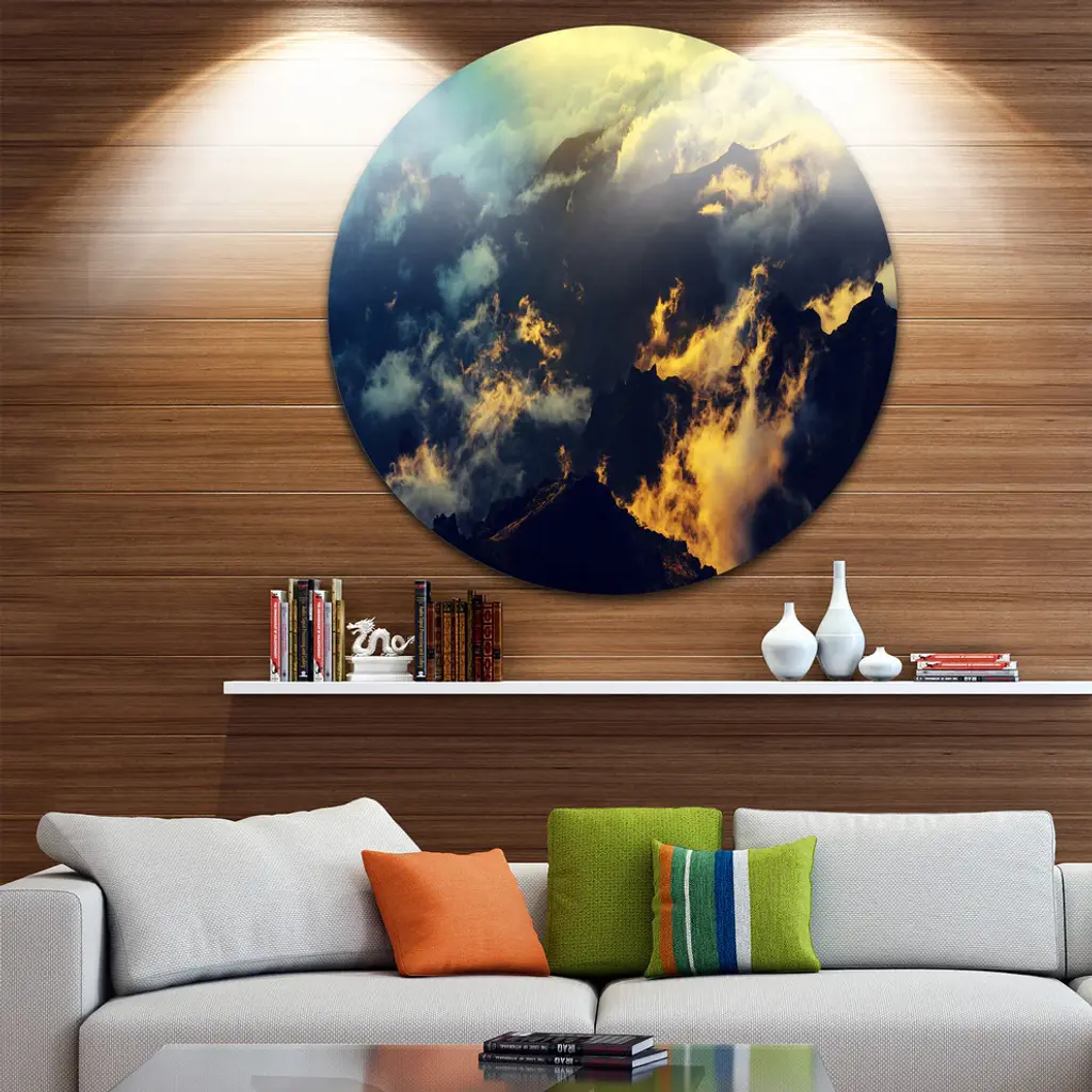 Bring Contemporary Abstraction to your home with this large Circle Metal wall art. This Sunset on Hill above Clouds Metal Artwork makes it the focal point of any room or office. - White Gloss Coating ensures colors are extra vibrant with light reflection.- Aluminum grade Sheet Metal with 1 inch mounting frame on the back giving the illusion that the artwork is floating on the wall..- Mounting Brackets are included along with instructions.- High Quality Digital images are created directly into a glossy aluminum panel producing a stunning and captivating print into the glossy finish of the metal.- Water, Fire and Scratch resistant HD Aluminum panels.- Looks better than any photo paper and guaranteed to last at least 20 years- Easy to clean with a microfiber cloth. Colors are far superior to regular Canvas Art. - Easy to Hang