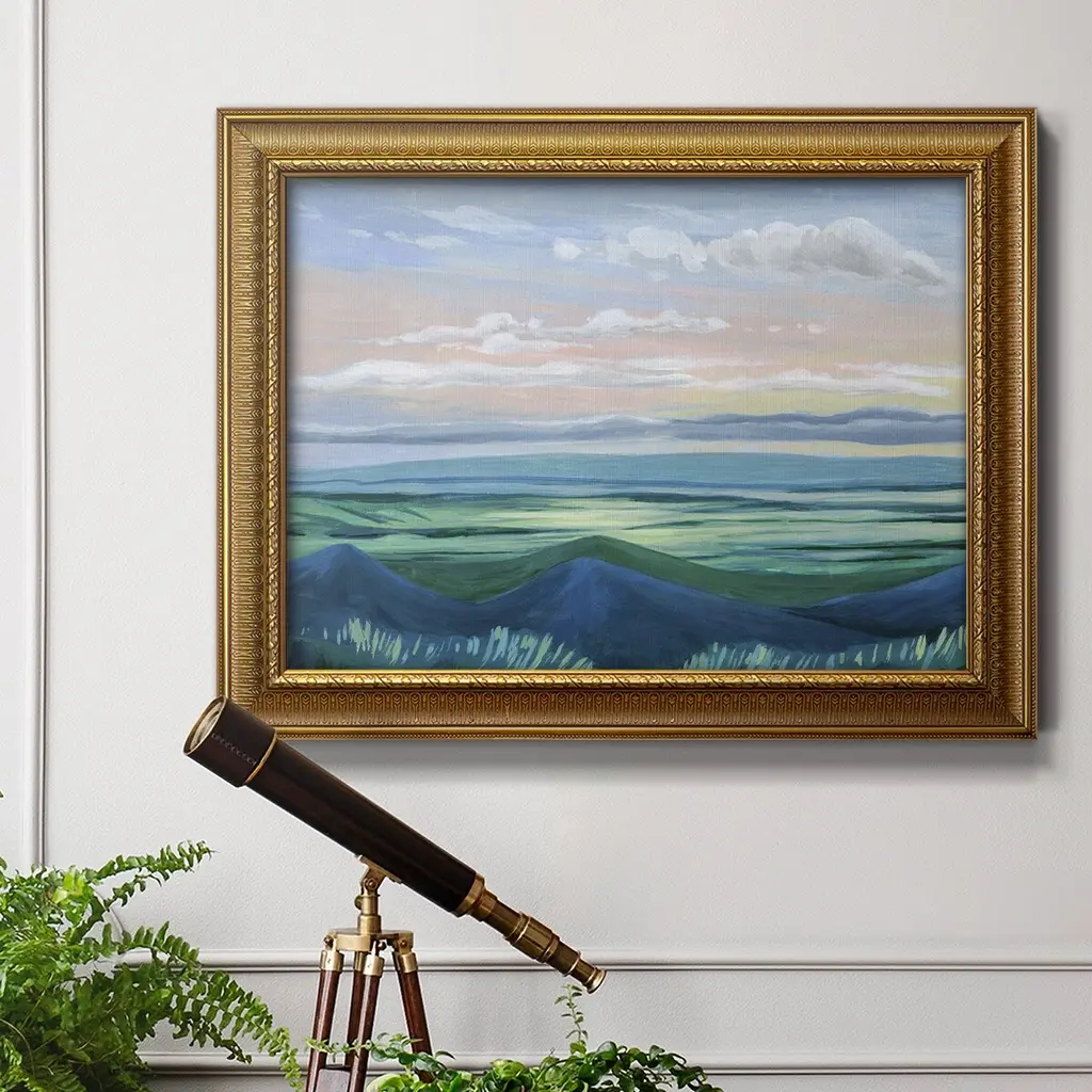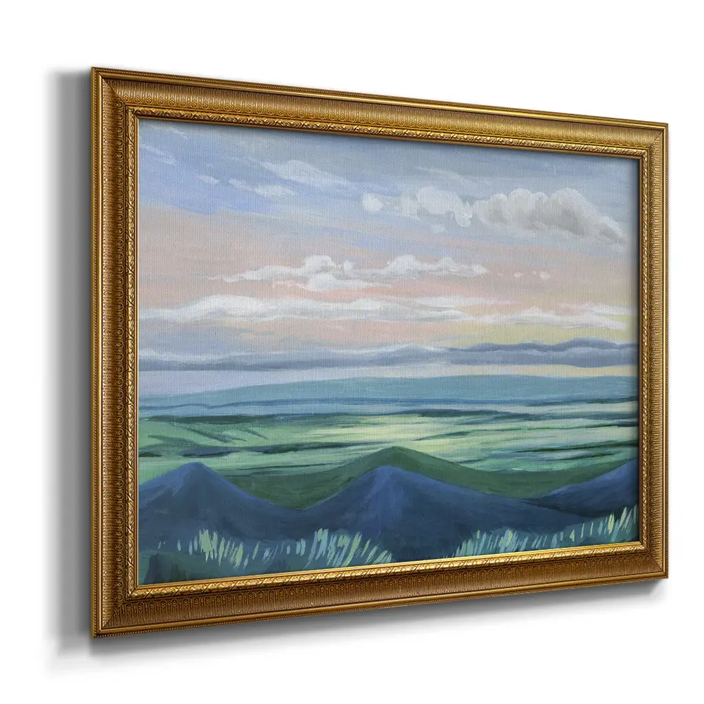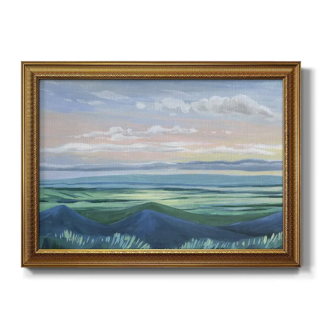 Sunset Outlook I Premium Framed Canvas- Ready to Hang A Premium Framed Canvas created to last. Framed in distressed wood and available in an array of sizes and colors Featuring a beveled a solid wood stretcher bar, each piece comes ready to hand 3 SIZES AVAILABLE 16''X20'' - Overall Size 18'X27'' - Overall Size 24''x36'' - Overall Size Each piece is made to order. Each piece comes with hanging hardware. Made in the USA Ready to Hang Giclee Paper Print Acrylic Glass Beveled Matt Board