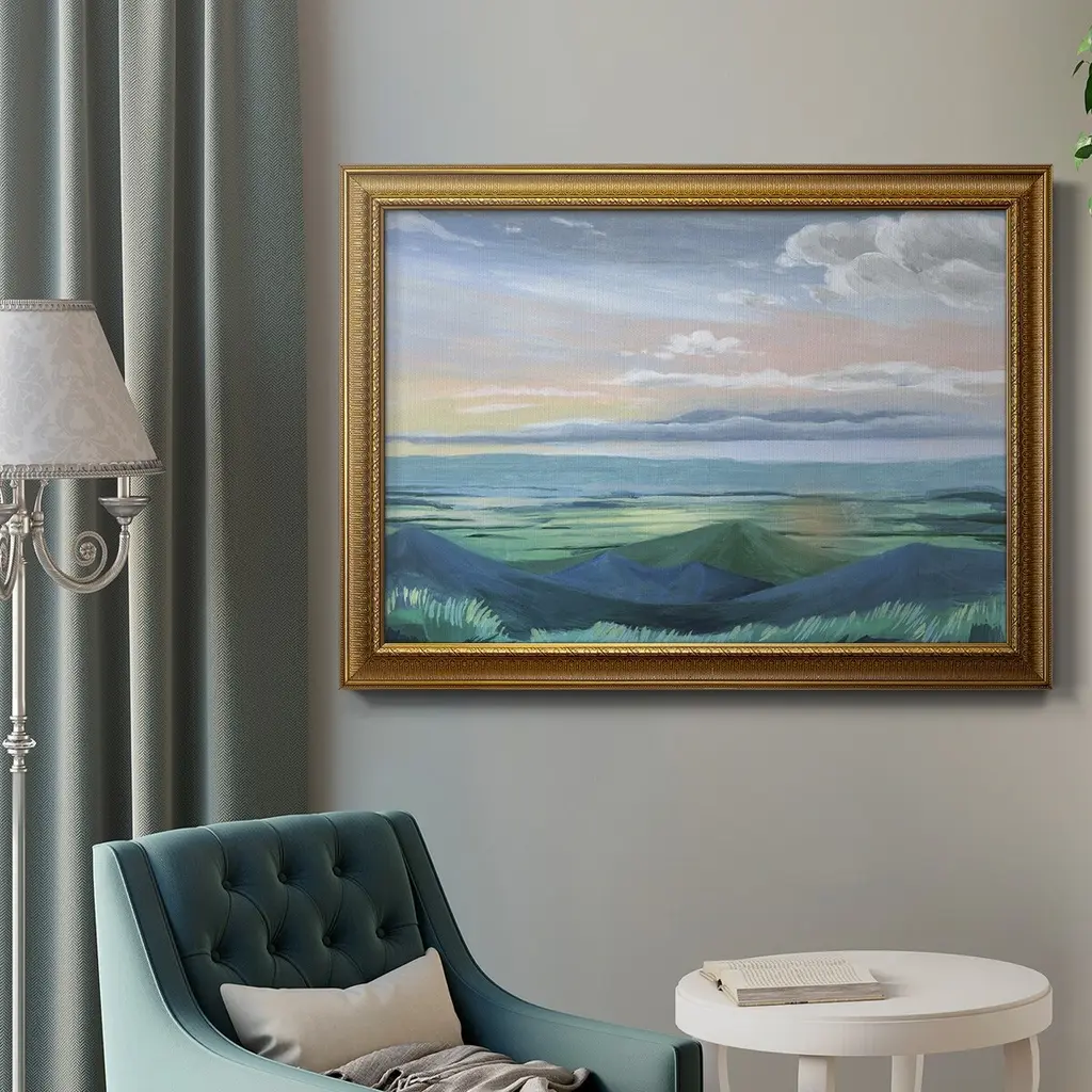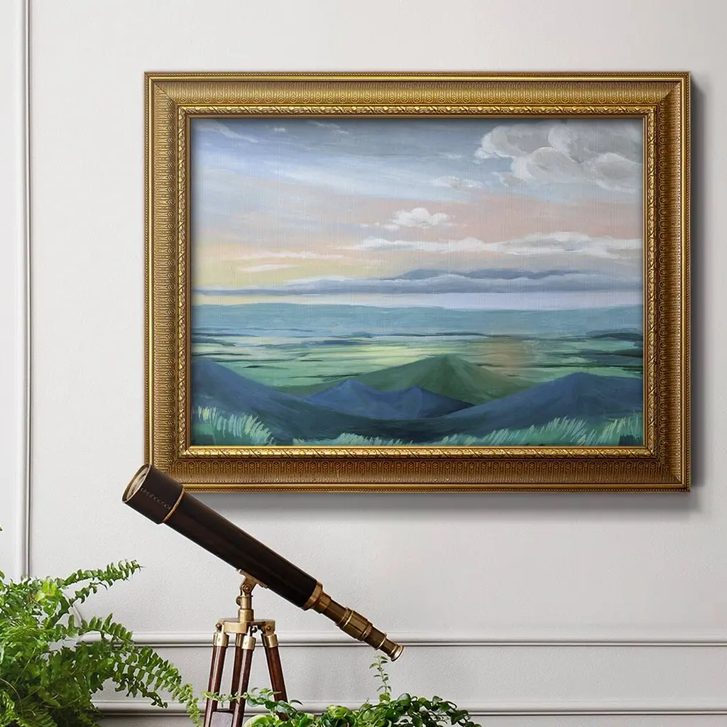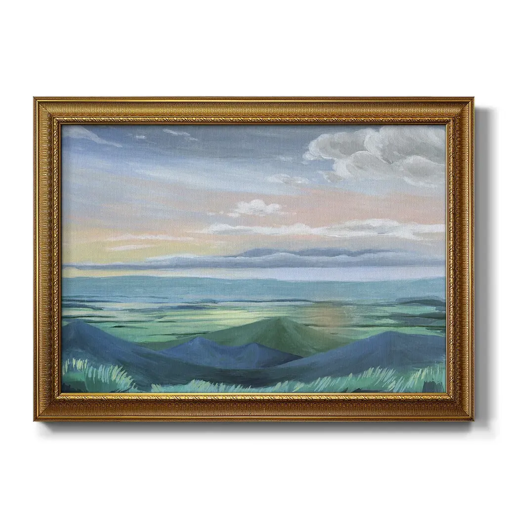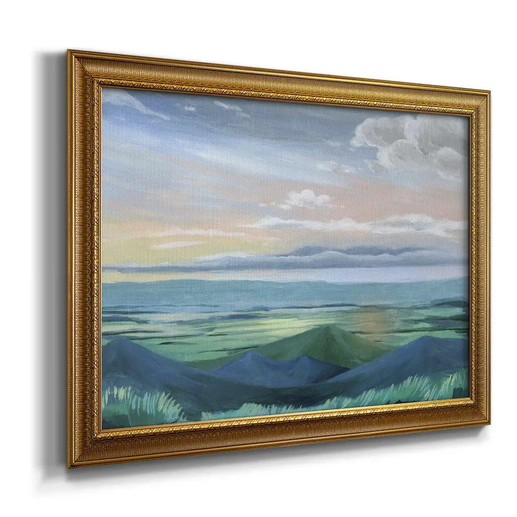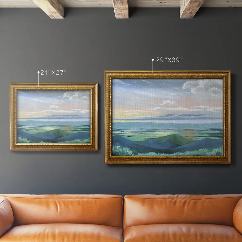 Sunset Outlook II Premium Framed Canvas- Ready to Hang A Premium Framed Canvas created to last. Framed in distressed wood and available in an array of sizes and colors Featuring a beveled a solid wood stretcher bar, each piece comes ready to hand 3 SIZES AVAILABLE 16''X20'' - Overall Size 18'X27'' - Overall Size 24''x36'' - Overall Size Each piece is made to order. Each piece comes with hanging hardware. Made in the USA Ready to Hang Giclee Paper Print Acrylic Glass Beveled Matt Board