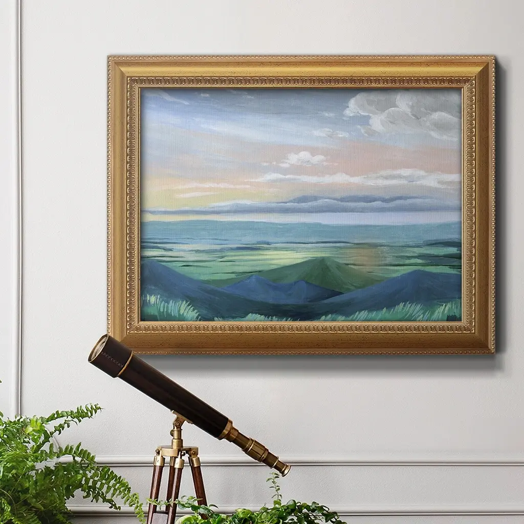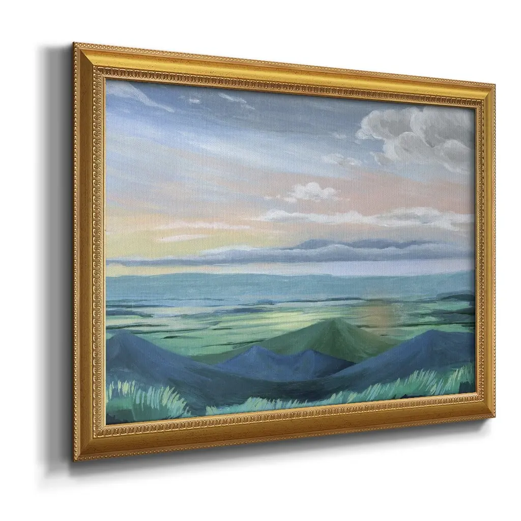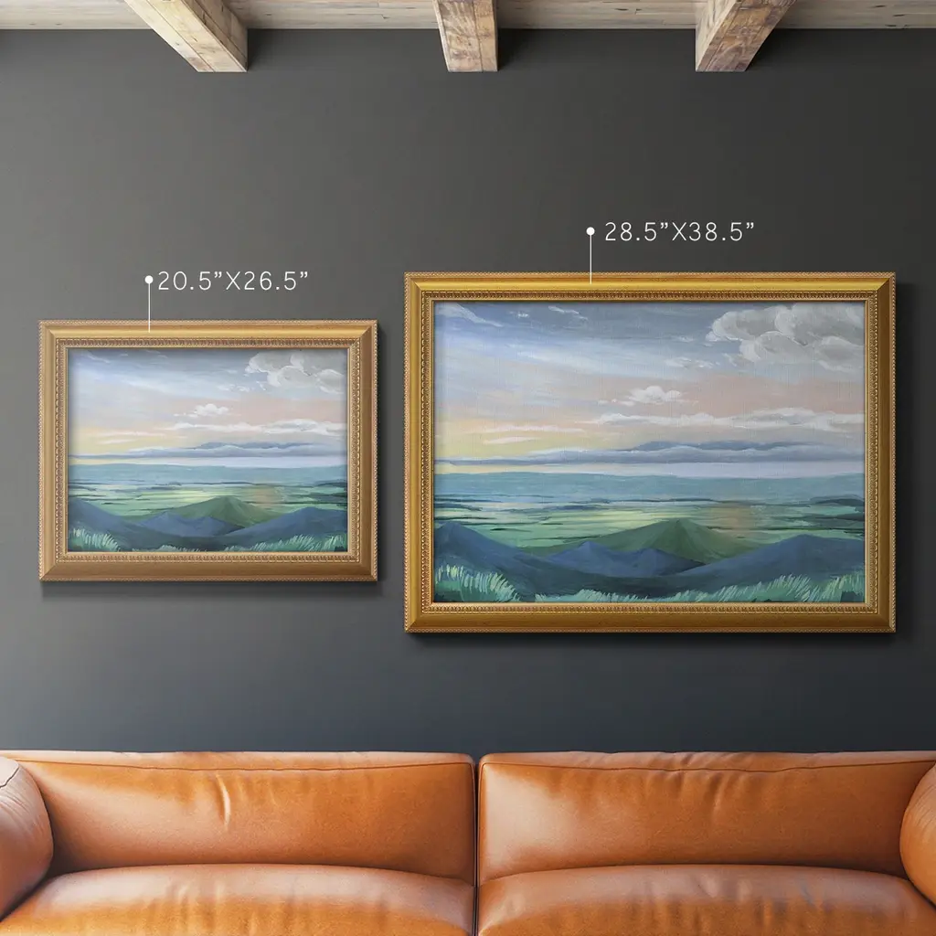 Sunset Outlook II Premium Framed Canvas- Ready to Hang A Premium Framed Canvas created to last. Framed in distressed wood and available in an array of sizes and colors Featuring a beveled a solid wood stretcher bar, each piece comes ready to hand 3 SIZES AVAILABLE 16''X20'' - Overall Size 18'X27'' - Overall Size 24''x36'' - Overall Size Each piece is made to order. Each piece comes with hanging hardware. Made in the USA Ready to Hang Giclee Paper Print Acrylic Glass Beveled Matt Board