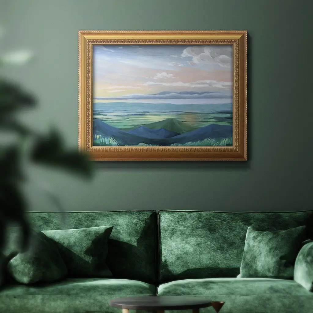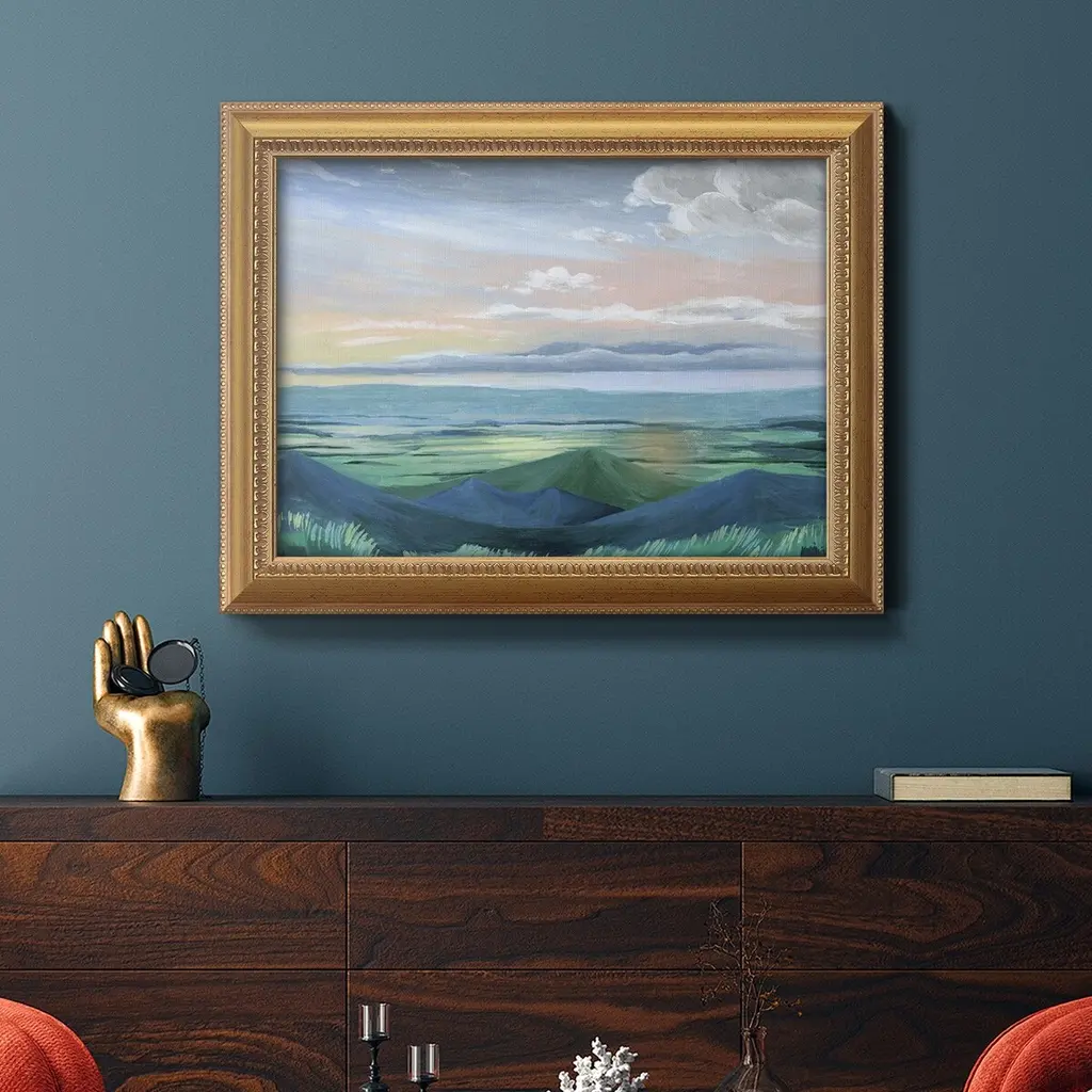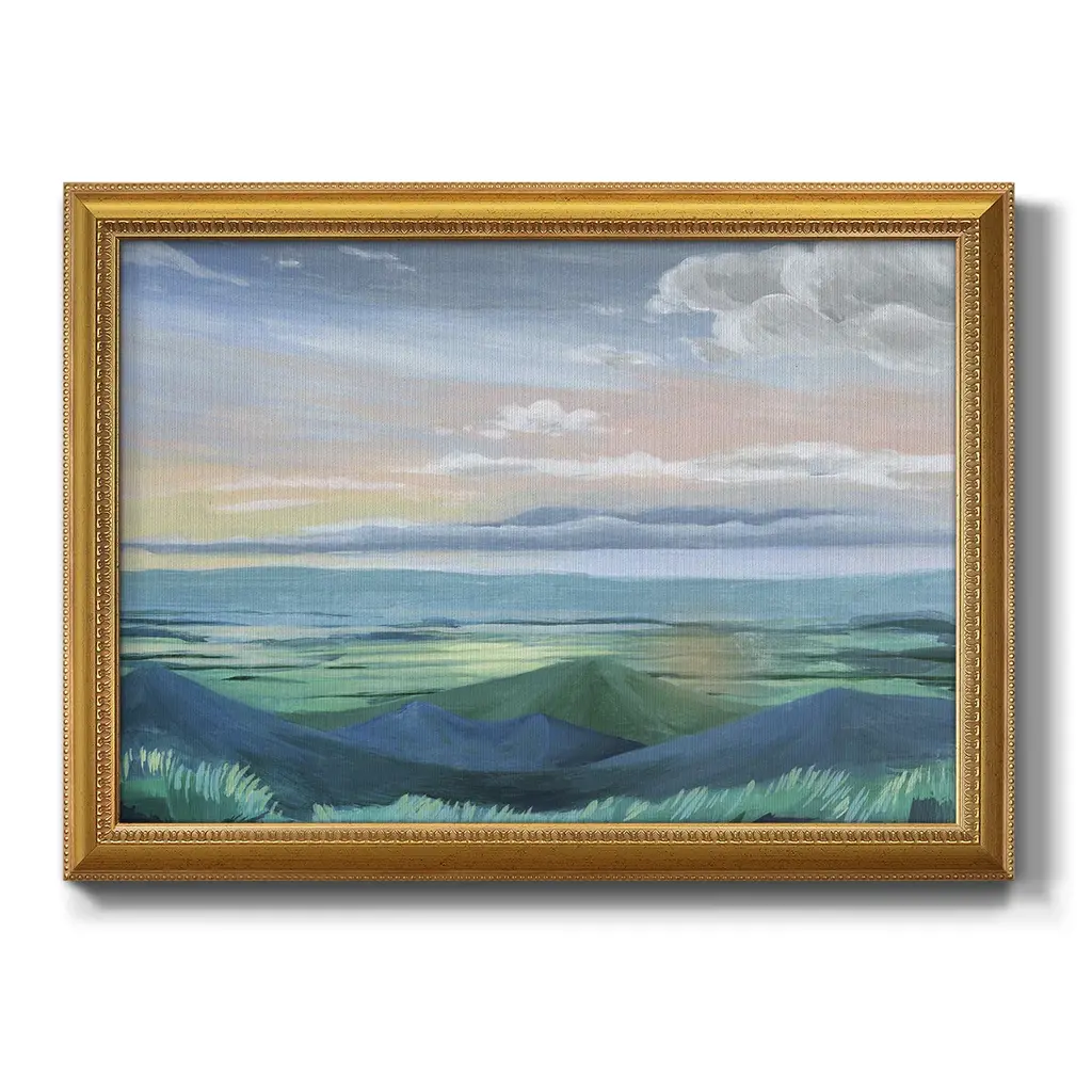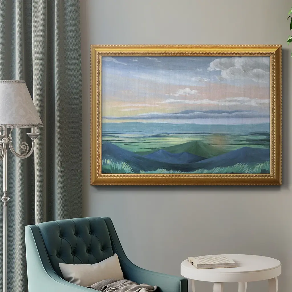 Sunset Outlook II Premium Framed Canvas- Ready to Hang A Premium Framed Canvas created to last. Framed in distressed wood and available in an array of sizes and colors Featuring a beveled a solid wood stretcher bar, each piece comes ready to hand 3 SIZES AVAILABLE 16''X20'' - Overall Size 18'X27'' - Overall Size 24''x36'' - Overall Size Each piece is made to order. Each piece comes with hanging hardware. Made in the USA Ready to Hang Giclee Paper Print Acrylic Glass Beveled Matt Board