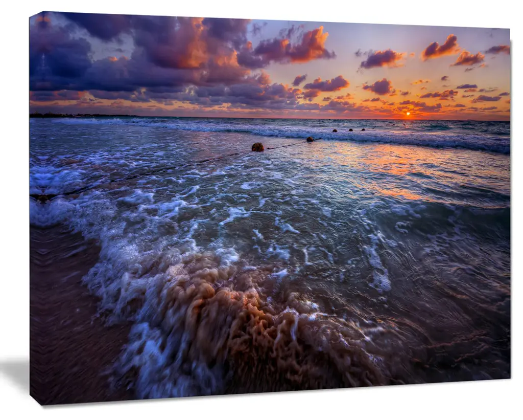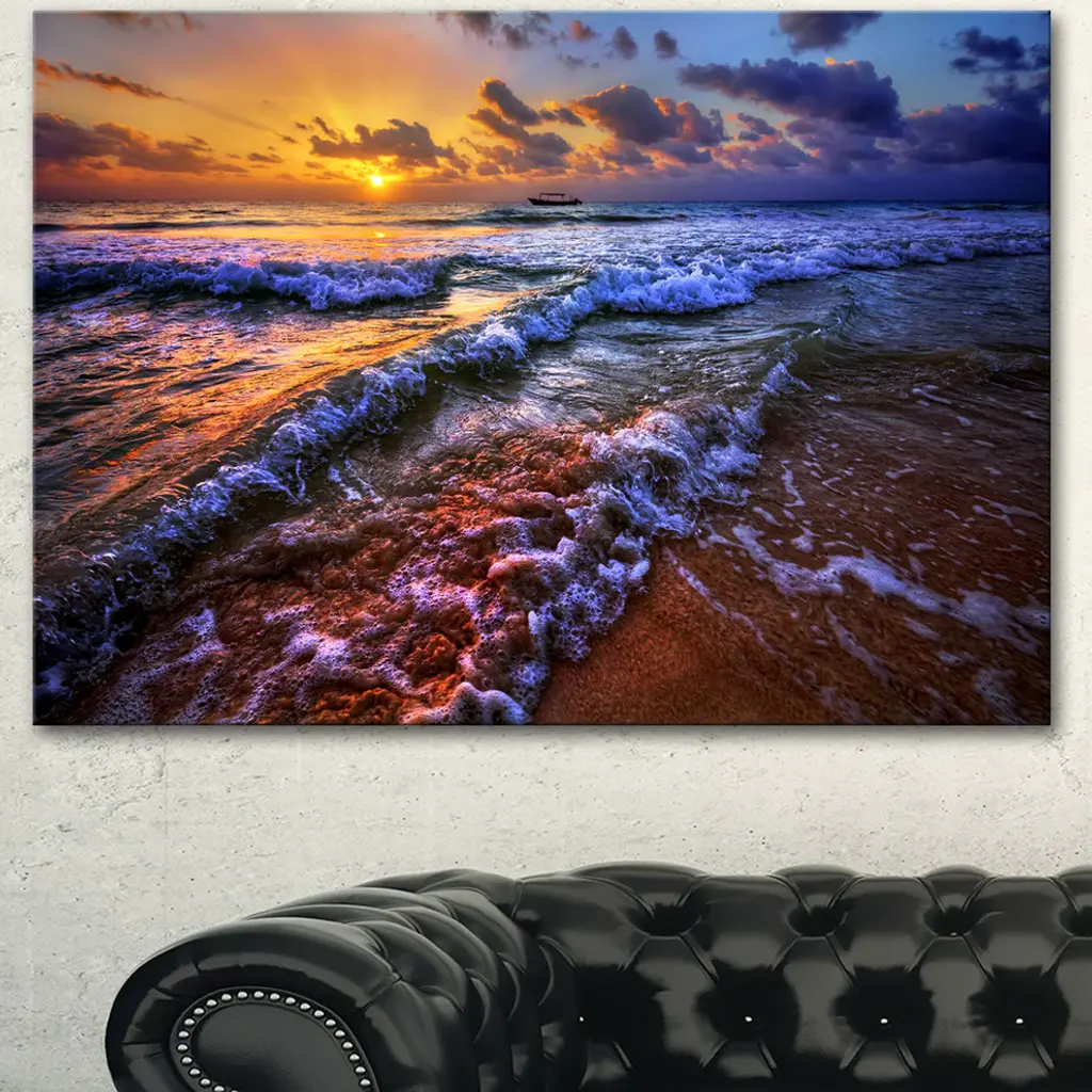 Sunset Over Blue Tinged Waves, Seashore Photo Canvas Art Print, 60"x28"