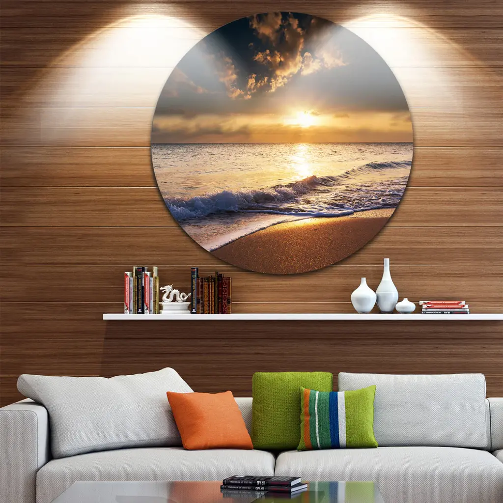 Bring Contemporary Abstraction to your home with this large Circle Metal wall art. This Sunset over Foaming Waves Metal Artwork makes it the focal point of any room or office. - White Gloss Coating ensures colors are extra vibrant with light reflection.- Aluminum grade Sheet Metal with 1 inch mounting frame on the back giving the illusion that the artwork is floating on the wall..- Mounting Brackets are included along with instructions.- High Quality Digital images are created directly into a glossy aluminum panel producing a stunning and captivating print into the glossy finish of the metal.- Water, Fire and Scratch resistant HD Aluminum panels.- Looks better than any photo paper and guaranteed to last at least 20 years- Easy to clean with a microfiber cloth. Colors are far superior to regular Canvas Art. - Easy to Hang