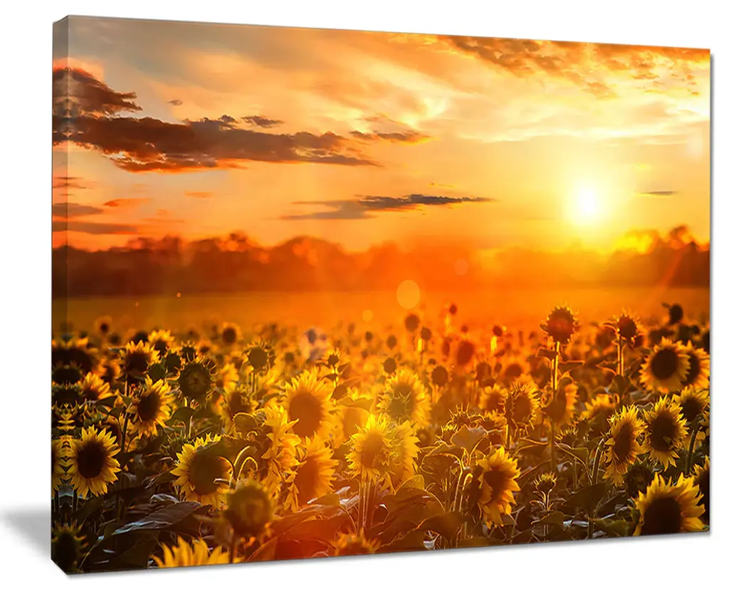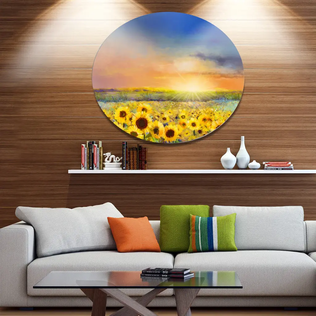 Bring Contemporary Abstraction to your home with this large Circle Metal wall art. This Sunset over Golden Sunflower Field Metal Artwork makes it the focal point of any room or office. - White Gloss Coating ensures colors are extra vibrant with light reflection.- Aluminum grade Sheet Metal with 1 inch mounting frame on the back giving the illusion that the artwork is floating on the wall..- Mounting Brackets are included along with instructions.- High Quality Digital images are created directly into a glossy aluminum panel producing a stunning and captivating print into the glossy finish of the metal.- Water, Fire and Scratch resistant HD Aluminum panels.- Looks better than any photo paper and guaranteed to last at least 20 years- Easy to clean with a microfiber cloth. Colors are far superior to regular Canvas Art. - Easy to Hang