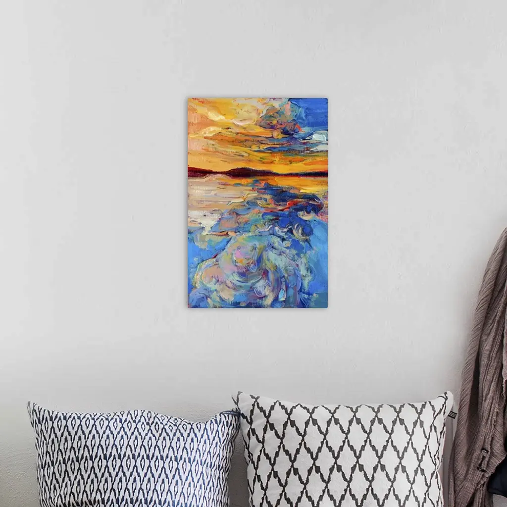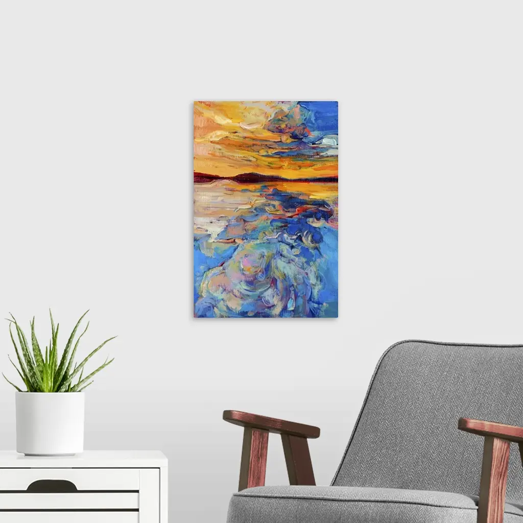 Originally an oil painting of sea and sky on canvas. Sunset over ocean. Modern impressionism.