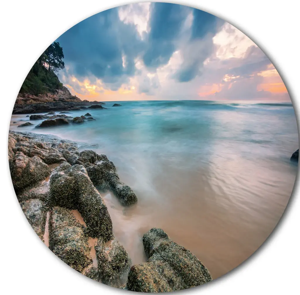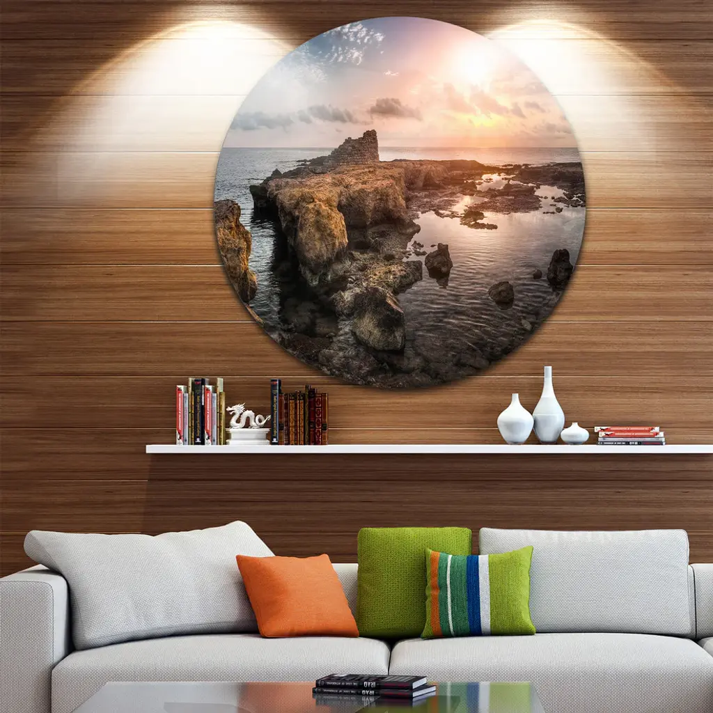 Bring Contemporary Abstraction to your home with this large Circle Metal wall art. This Sunset over Rocky African Coast Metal Artwork makes it the focal point of any room or office. - White Gloss Coating ensures colors are extra vibrant with light reflection.- Aluminum grade Sheet Metal with 1 inch mounting frame on the back giving the illusion that the artwork is floating on the wall..- Mounting Brackets are included along with instructions.- High Quality Digital images are created directly into a glossy aluminum panel producing a stunning and captivating print into the glossy finish of the metal.- Water, Fire and Scratch resistant HD Aluminum panels.- Looks better than any photo paper and guaranteed to last at least 20 years- Easy to clean with a microfiber cloth. Colors are far superior to regular Canvas Art. - Easy to Hang