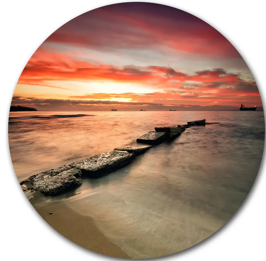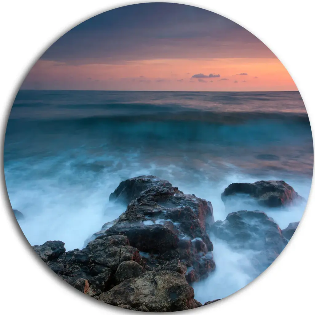 Bring Contemporary Abstraction to your home with this large Circle Metal wall art. This Sunset over Rocky Ocean Shore Metal Artwork makes it the focal point of any room or office. - White Gloss Coating ensures colors are extra vibrant with light reflection.- Aluminum grade Sheet Metal with 1 inch mounting frame on the back giving the illusion that the artwork is floating on the wall..- Mounting Brackets are included along with instructions.- High Quality Digital images are created directly into a glossy aluminum panel producing a stunning and captivating print into the glossy finish of the metal.- Water, Fire and Scratch resistant HD Aluminum panels.- Looks better than any photo paper and guaranteed to last at least 20 years- Easy to clean with a microfiber cloth. Colors are far superior to regular Canvas Art. - Easy to Hang