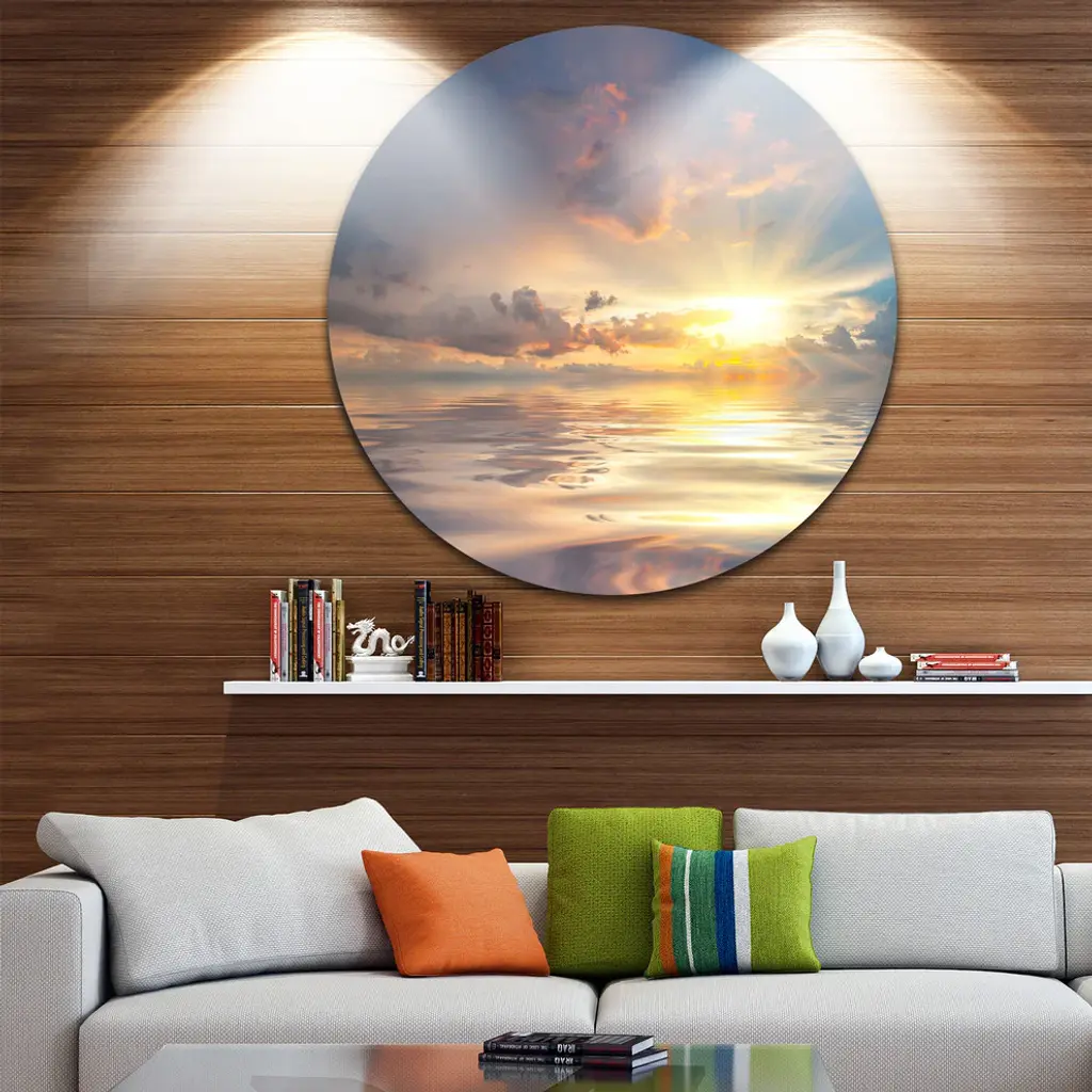 Bring Contemporary Abstraction to your home with this large Circle Metal wall art. This Sunset Over Sea with Reflection Metal Artwork makes it the focal point of any room or office. - White Gloss Coating ensures colors are extra vibrant with light reflection.- Aluminum grade Sheet Metal with 1 inch mounting frame on the back giving the illusion that the artwork is floating on the wall..- Mounting Brackets are included along with instructions.- High Quality Digital images are created directly into a glossy aluminum panel producing a stunning and captivating print into the glossy finish of the metal.- Water, Fire and Scratch resistant HD Aluminum panels.- Looks better than any photo paper and guaranteed to last at least 20 years- Easy to clean with a microfiber cloth. Colors are far superior to regular Canvas Art. - Easy to Hang