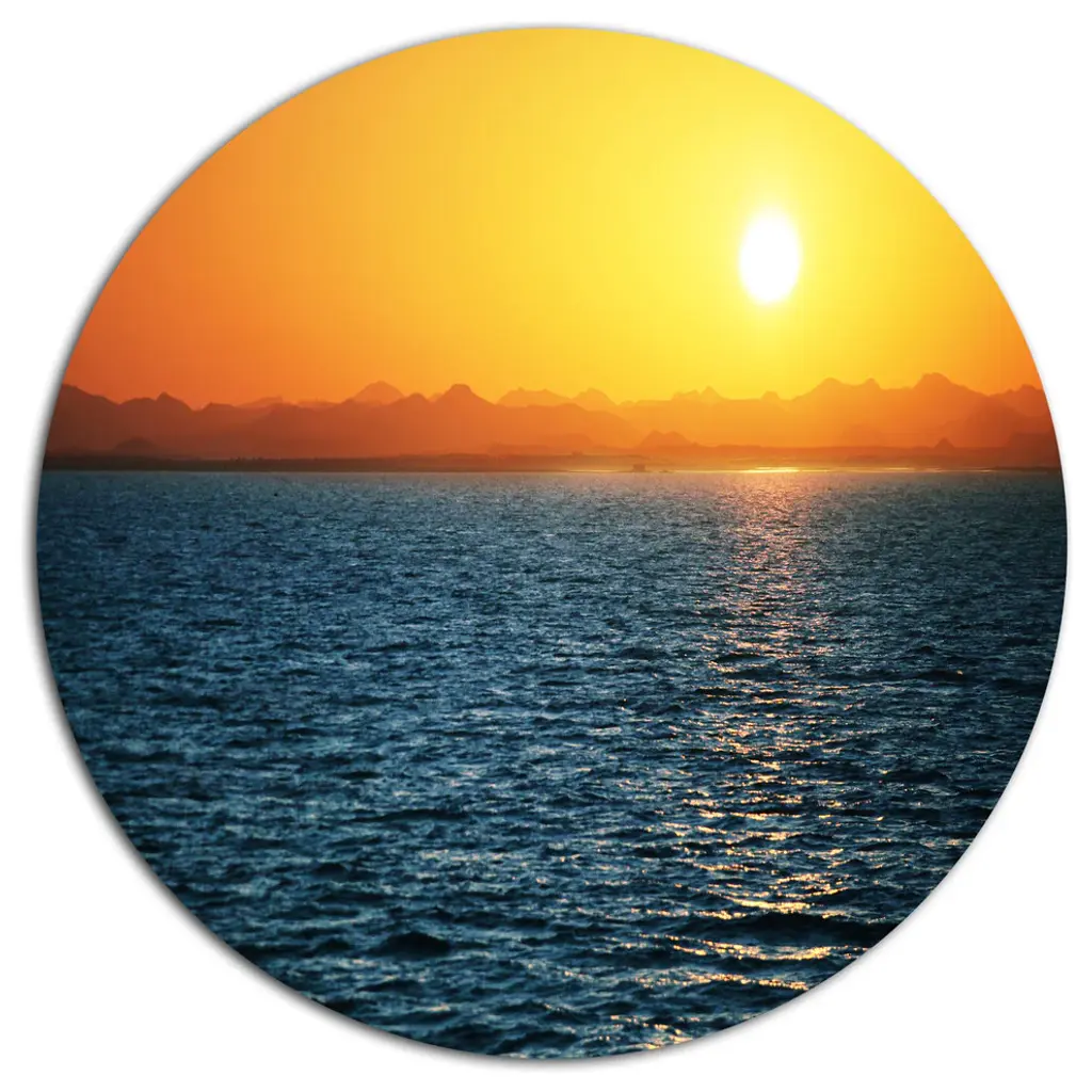 Bring Contemporary Abstraction to your home with this large Circle Metal wall art. This Sunset Panorama under Sea Surface Metal Artwork makes it the focal point of any room or office. - White Gloss Coating ensures colors are extra vibrant with light reflection.- Aluminum grade Sheet Metal with 1 inch mounting frame on the back giving the illusion that the artwork is floating on the wall..- Mounting Brackets are included along with instructions.- High Quality Digital images are created directly into a glossy aluminum panel producing a stunning and captivating print into the glossy finish of the metal.- Water, Fire and Scratch resistant HD Aluminum panels.- Looks better than any photo paper and guaranteed to last at least 20 years- Easy to clean with a microfiber cloth. Colors are far superior to regular Canvas Art. - Easy to Hang