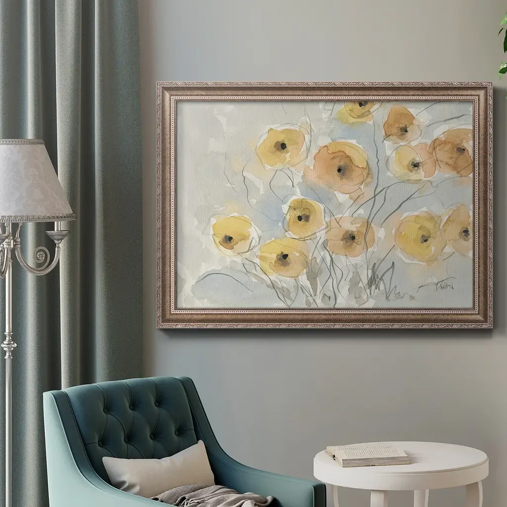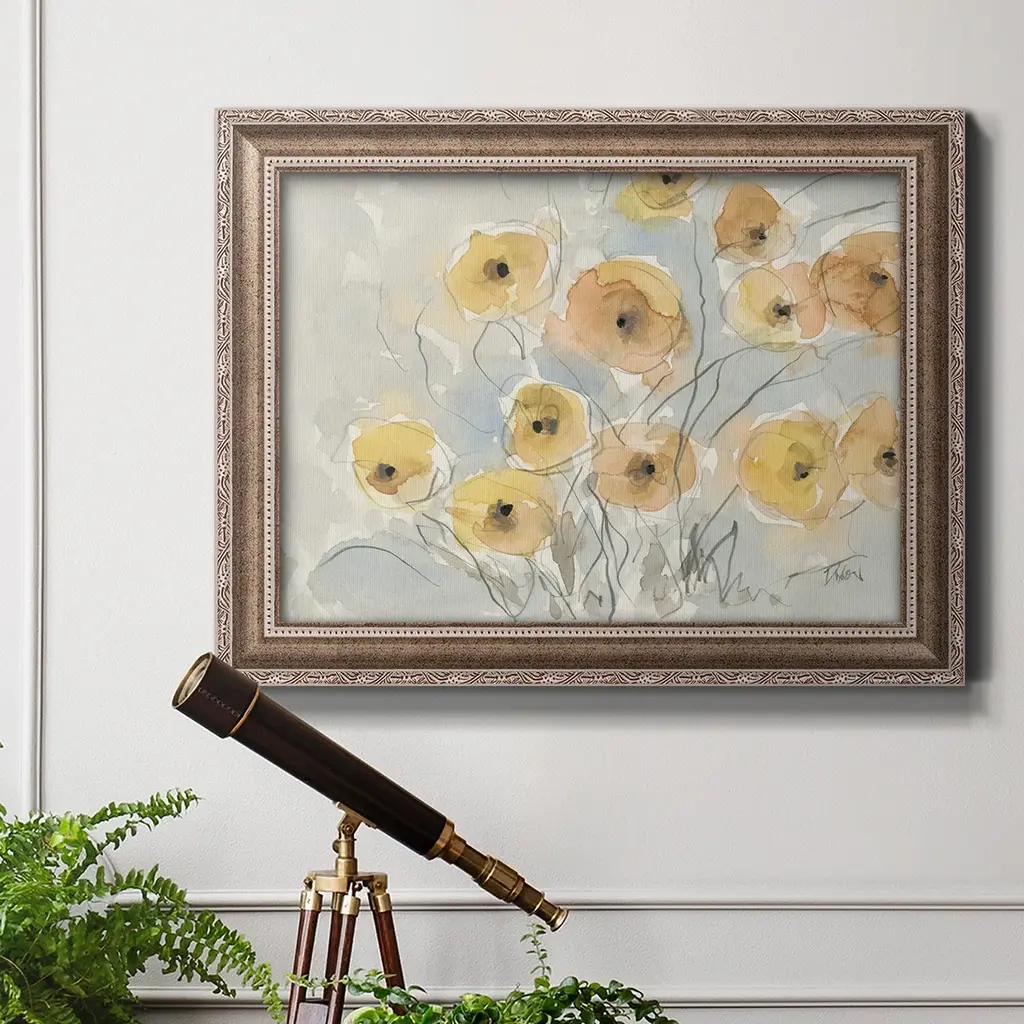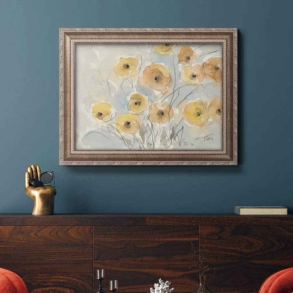 Sunset Poppies I Premium Framed Canvas- Ready to Hang A Premium Framed Canvas created to last. Framed in distressed wood and available in an array of sizes and colors Featuring a beveled a solid wood stretcher bar, each piece comes ready to hand 3 SIZES AVAILABLE 16''X20'' - Overall Size 18'X27'' - Overall Size 24''x36'' - Overall Size Each piece is made to order. Each piece comes with hanging hardware. Made in the USA Ready to Hang Giclee Paper Print Acrylic Glass Beveled Matt Board