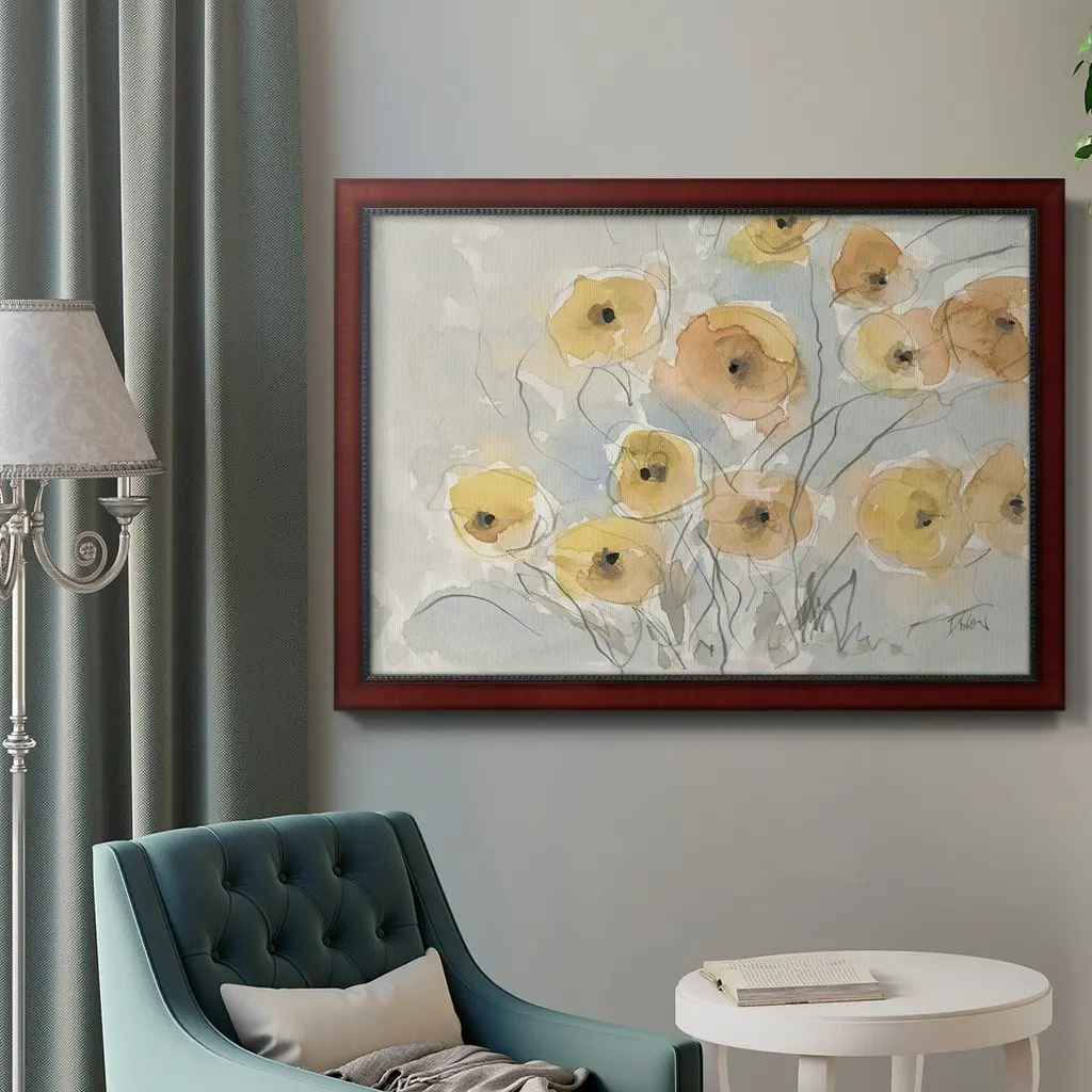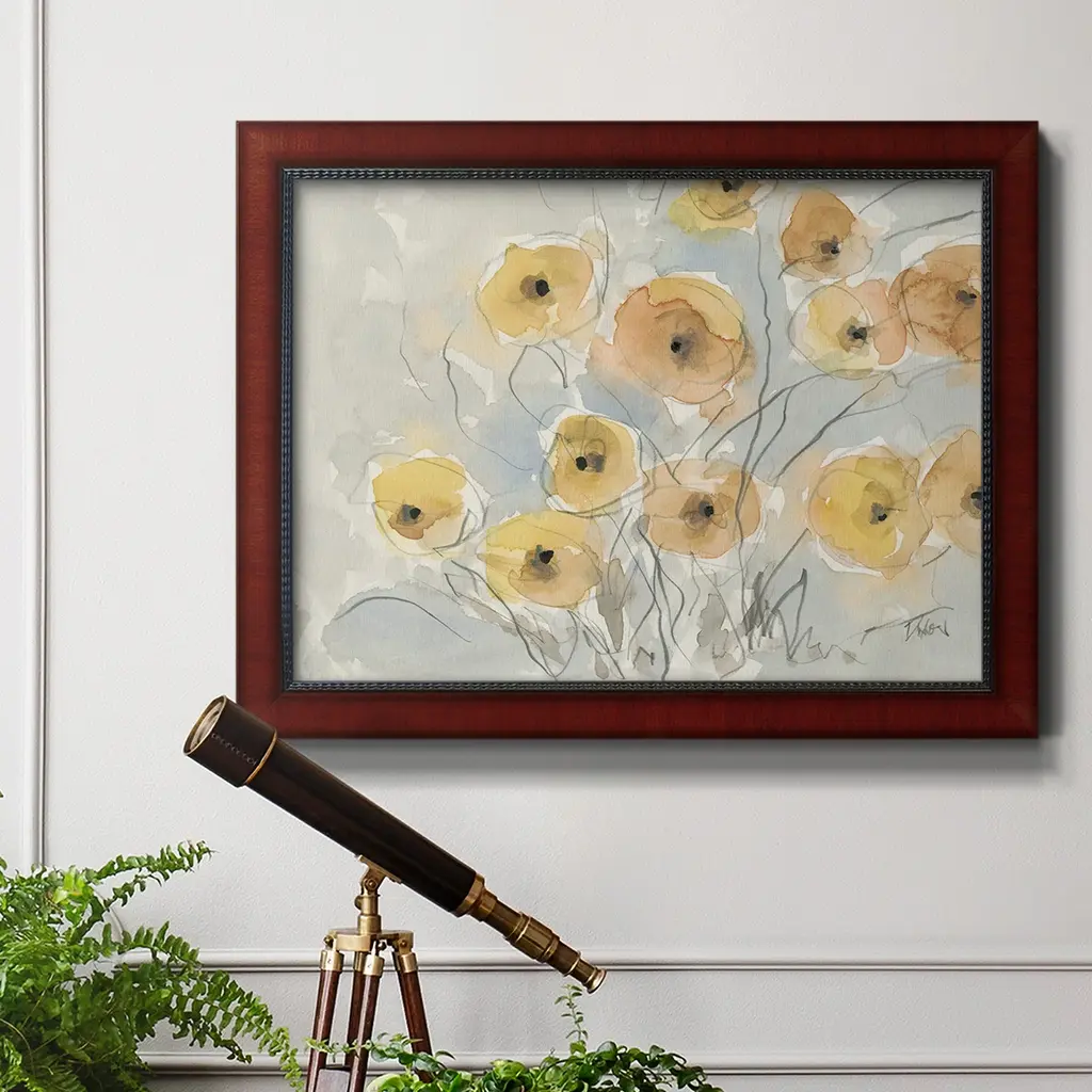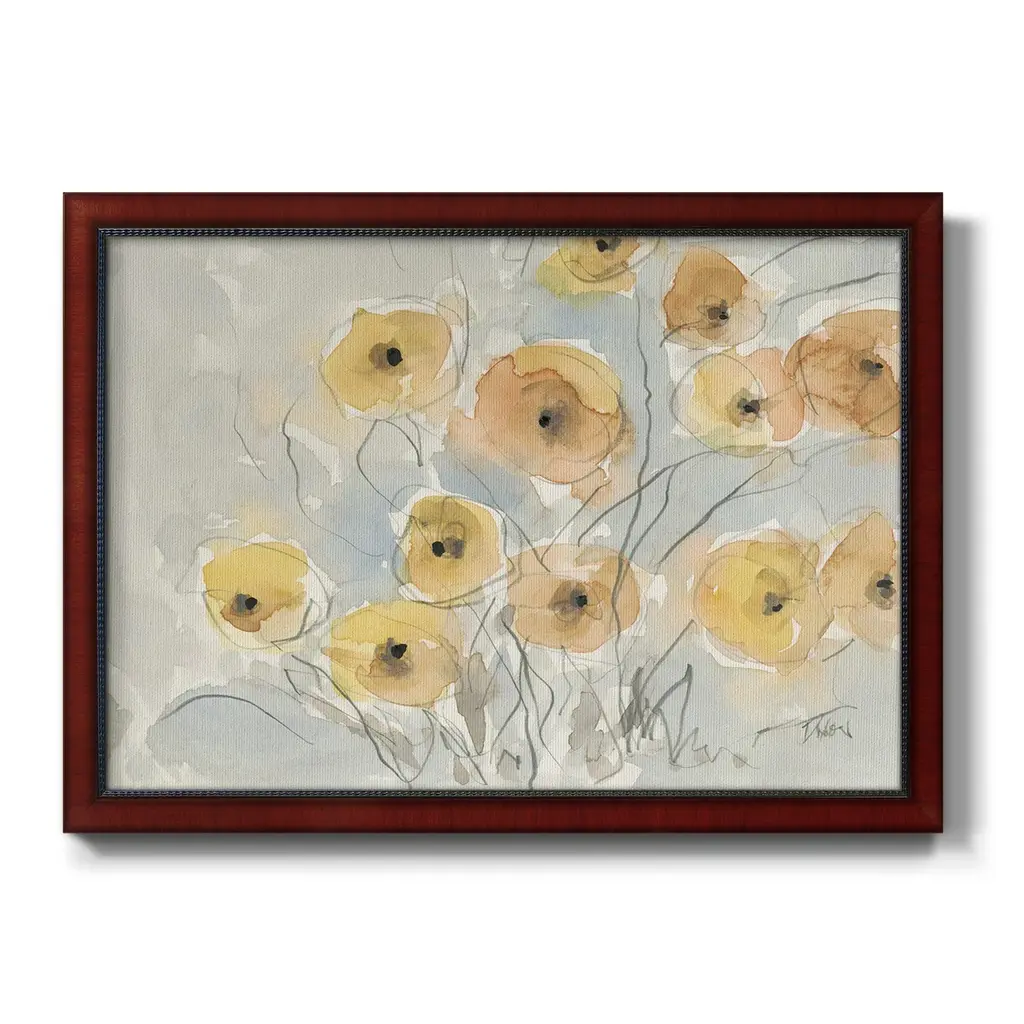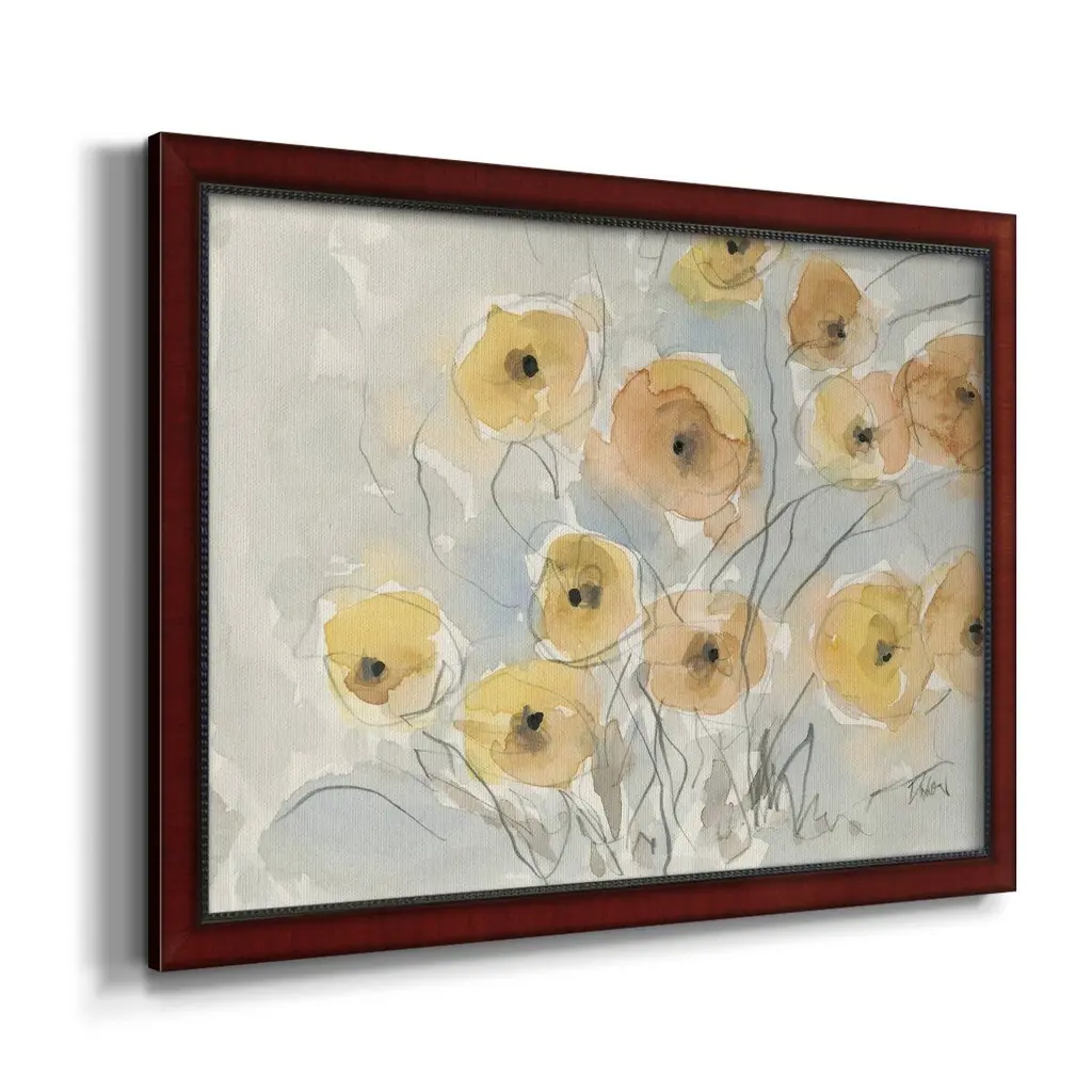 Sunset Poppies I Premium Framed Canvas- Ready to Hang A Premium Framed Canvas created to last. Framed in distressed wood and available in an array of sizes and colors Featuring a beveled a solid wood stretcher bar, each piece comes ready to hand 3 SIZES AVAILABLE 16''X20'' - Overall Size 18'X27'' - Overall Size 24''x36'' - Overall Size Each piece is made to order. Each piece comes with hanging hardware. Made in the USA Ready to Hang Giclee Paper Print Acrylic Glass Beveled Matt Board