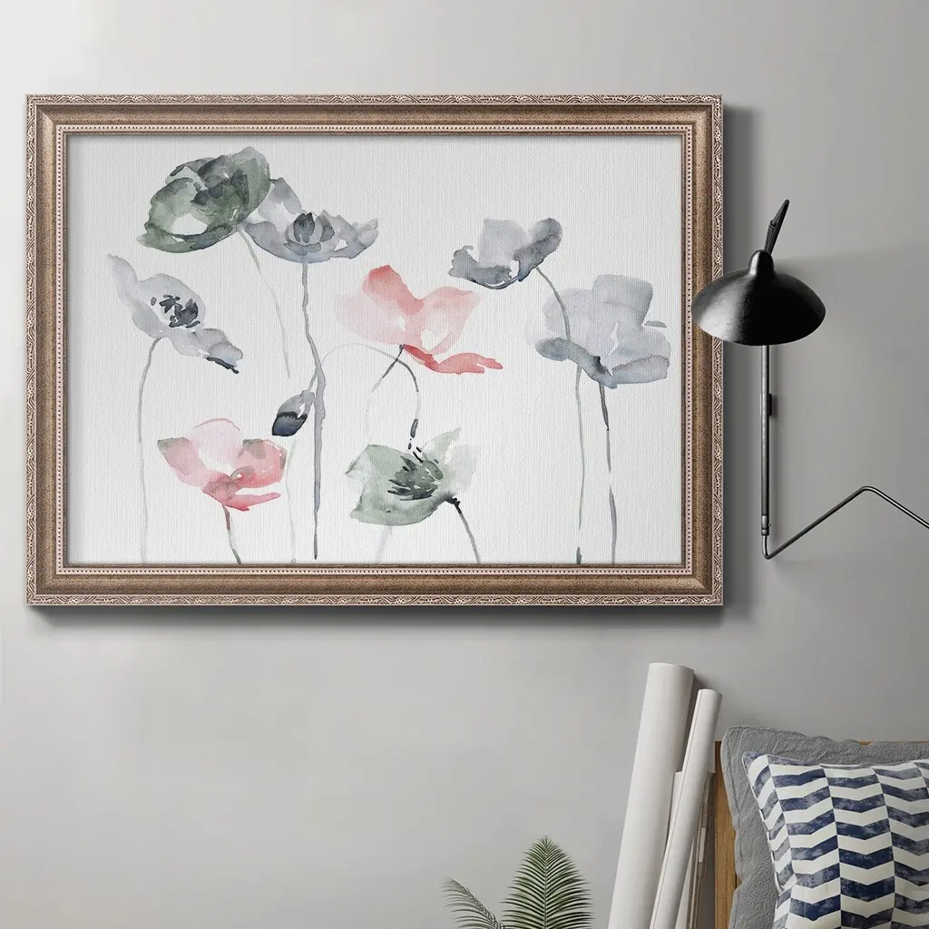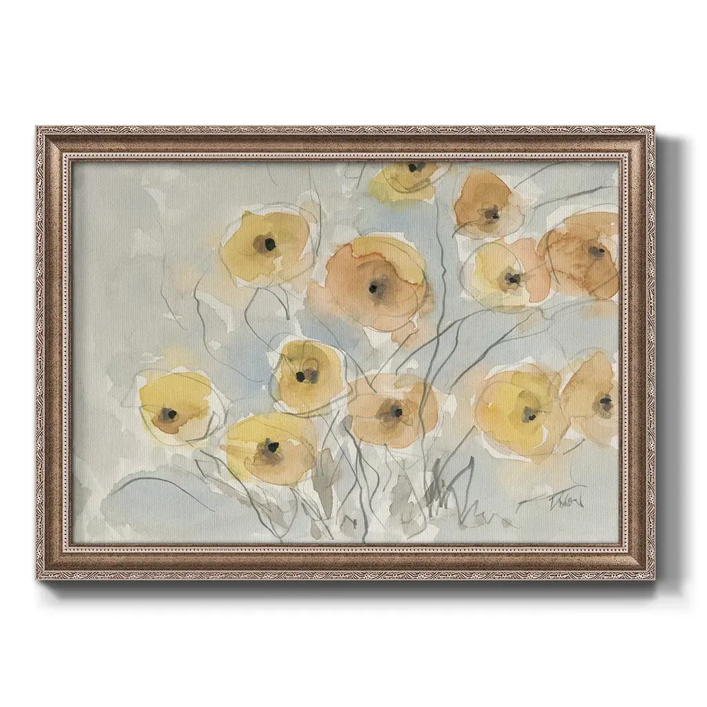 Sunset Poppies I Premium Framed Canvas- Ready to Hang A Premium Framed Canvas created to last. Framed in distressed wood and available in an array of sizes and colors Featuring a beveled a solid wood stretcher bar, each piece comes ready to hand 3 SIZES AVAILABLE 16''X20'' - Overall Size 18'X27'' - Overall Size 24''x36'' - Overall Size Each piece is made to order. Each piece comes with hanging hardware. Made in the USA Ready to Hang Giclee Paper Print Acrylic Glass Beveled Matt Board
