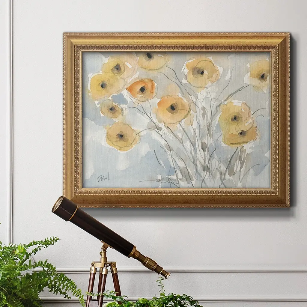 Sunset Poppies II Premium Framed Canvas- Ready to Hang A Premium Framed Canvas created to last. Framed in distressed wood and available in an array of sizes and colors Featuring a beveled a solid wood stretcher bar, each piece comes ready to hand 3 SIZES AVAILABLE 16''X20'' - Overall Size 18'X27'' - Overall Size 24''x36'' - Overall Size Each piece is made to order. Each piece comes with hanging hardware. Made in the USA Ready to Hang Giclee Paper Print Acrylic Glass Beveled Matt Board