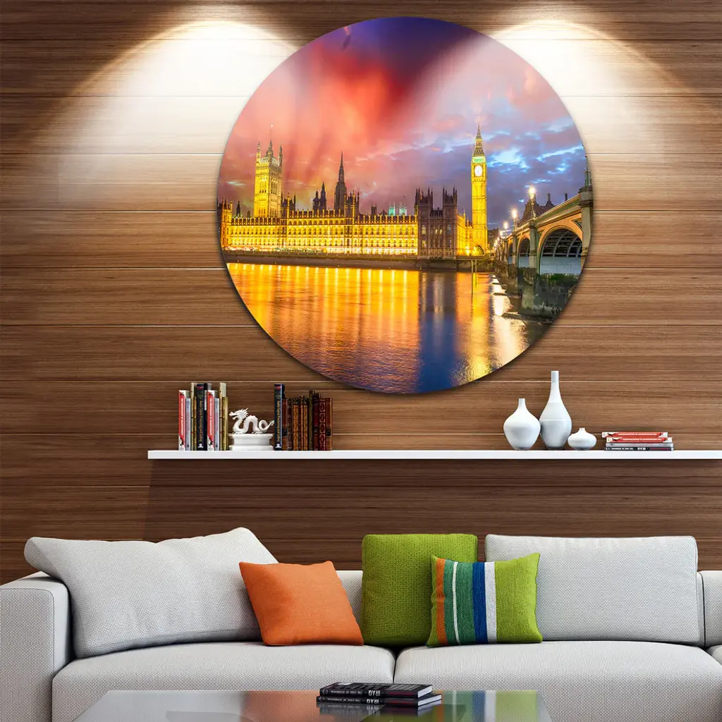 Bring Contemporary Abstraction to your home with this large Circle Metal wall art. This Sunset View of London Skyline Metal Artwork makes it the focal point of any room or office. - White Gloss Coating ensures colors are extra vibrant with light reflection.- Aluminum grade Sheet Metal with 1 inch mounting frame on the back giving the illusion that the artwork is floating on the wall..- Mounting Brackets are included along with instructions.- High Quality Digital images are created directly into a glossy aluminum panel producing a stunning and captivating print into the glossy finish of the metal.- Water, Fire and Scratch resistant HD Aluminum panels.- Looks better than any photo paper and guaranteed to last at least 20 years- Easy to clean with a microfiber cloth. Colors are far superior to regular Canvas Art. - Easy to Hang