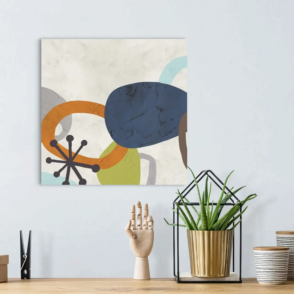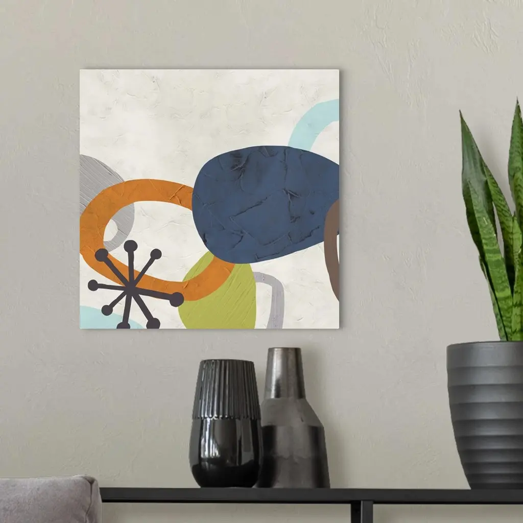 Contemporary abstract painting using organic funky shapes in muted colors against an off-white background in a retro style.