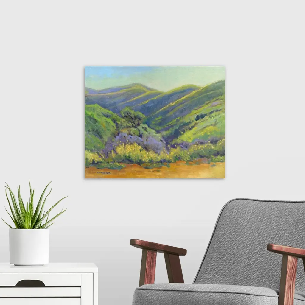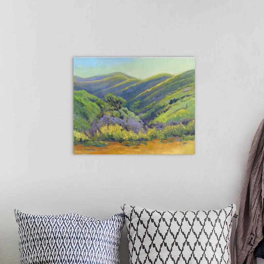 A contemporary painting of a row of trees and rolling hills in vibrant colors.