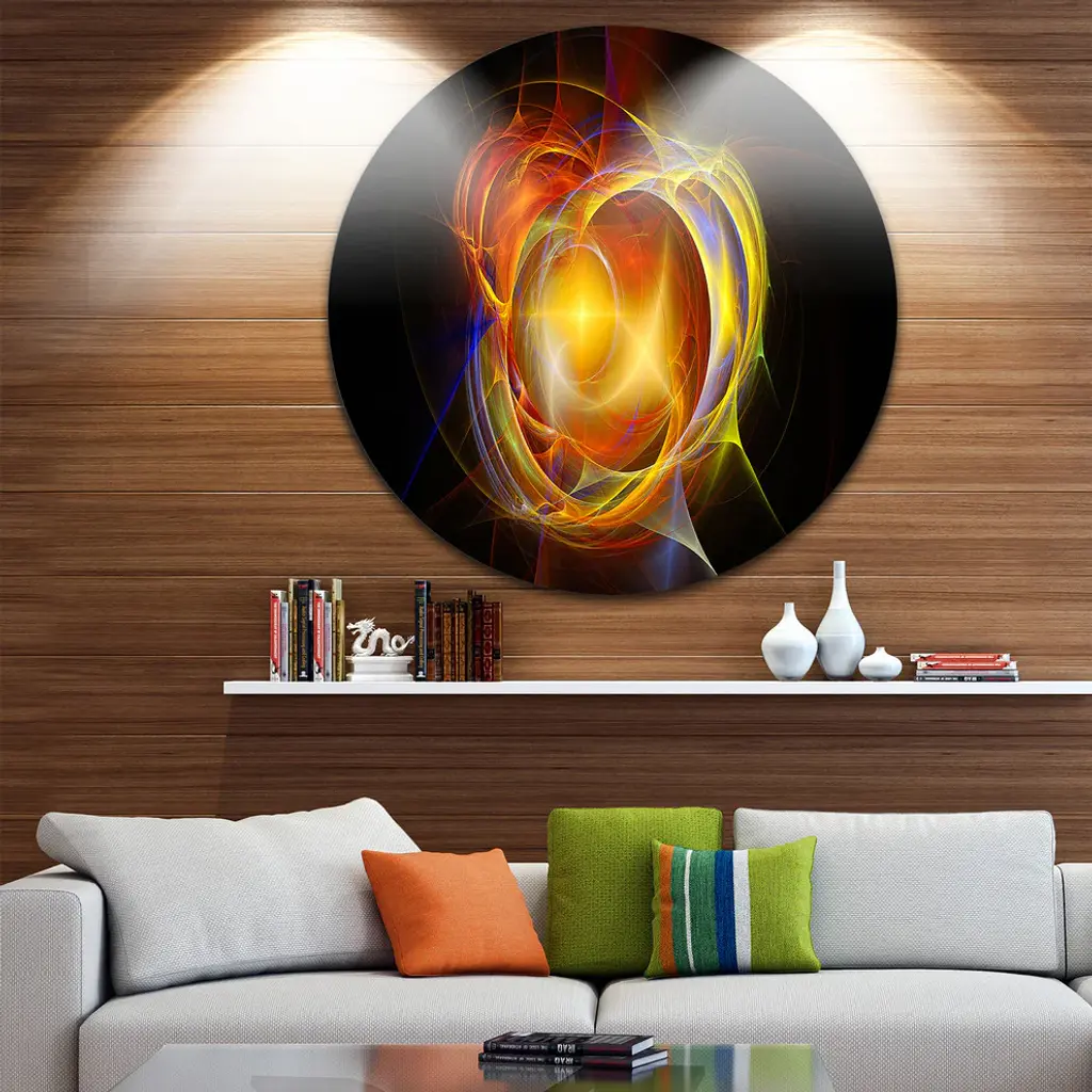 Bring Contemporary Abstraction to your home with this large Circle Metal wall art. This Supernova Explosion in Black Metal Artwork makes it the focal point of any room or office. - White Gloss Coating ensures colors are extra vibrant with light reflection.- Aluminum grade Sheet Metal with 1 inch mounting frame on the back giving the illusion that the artwork is floating on the wall..- Mounting Brackets are included along with instructions.- High Quality Digital images are created directly into a glossy aluminum panel producing a stunning and captivating print into the glossy finish of the metal.- Water, Fire and Scratch resistant HD Aluminum panels.- Looks better than any photo paper and guaranteed to last at least 20 years- Easy to clean with a microfiber cloth. Colors are far superior to regular Canvas Art. - Easy to Hang
