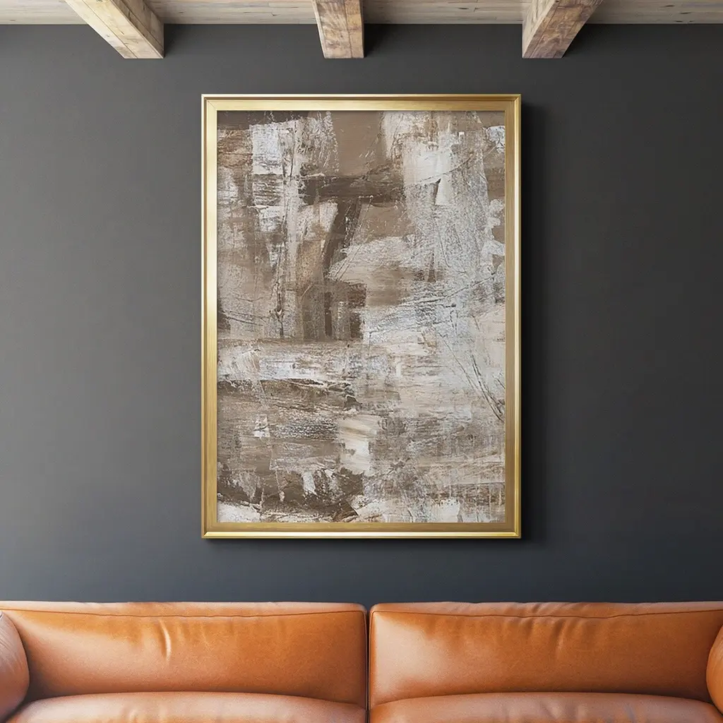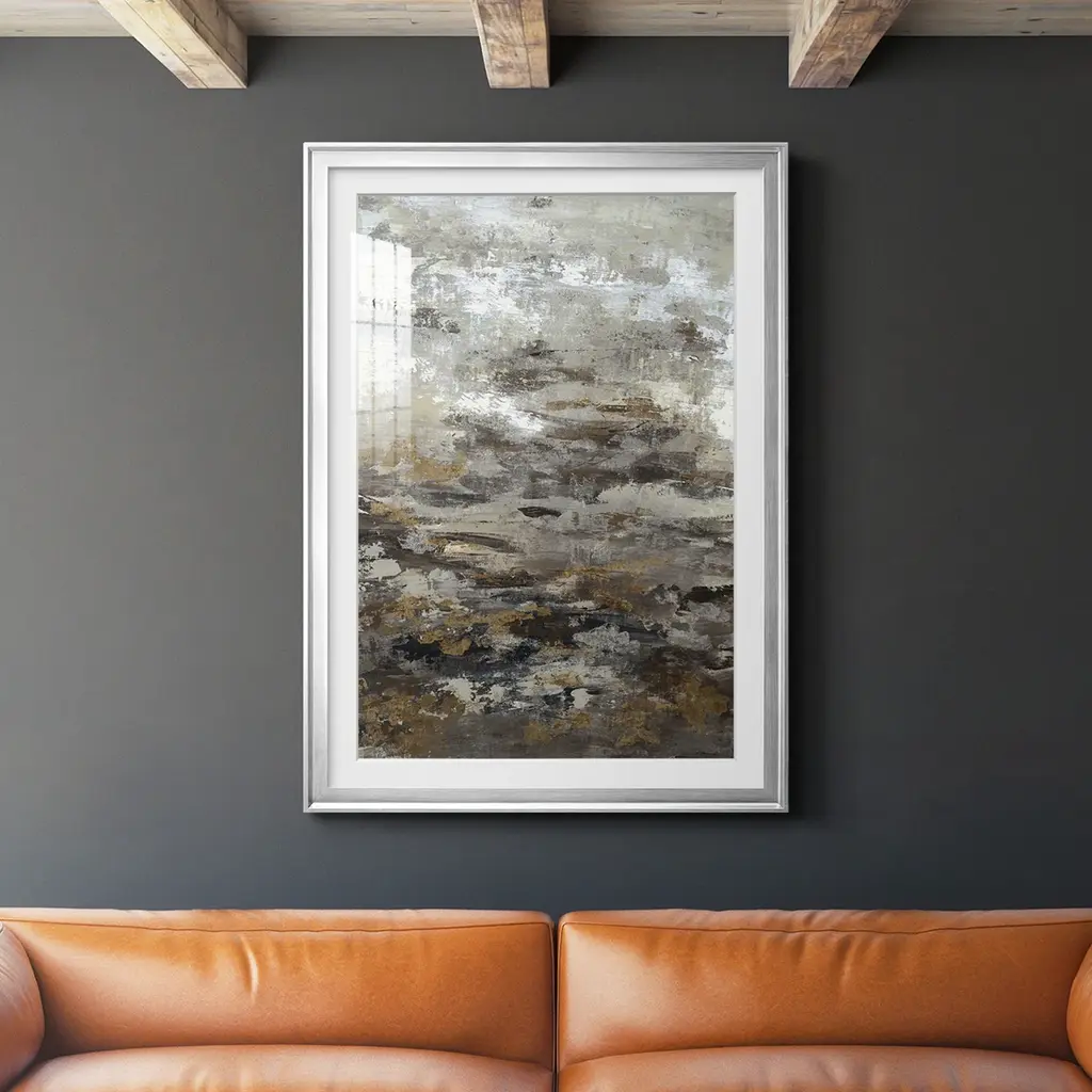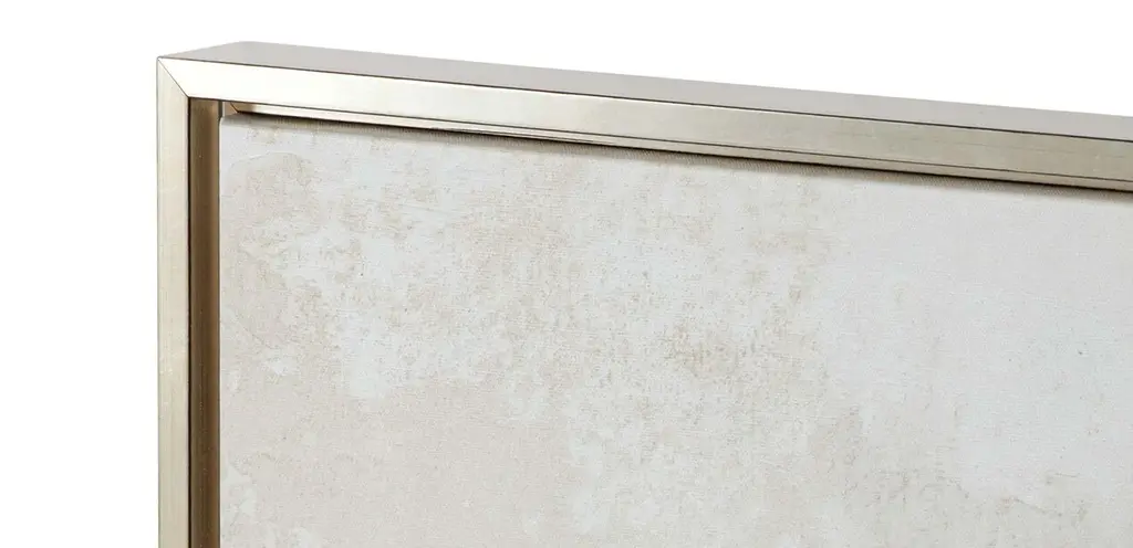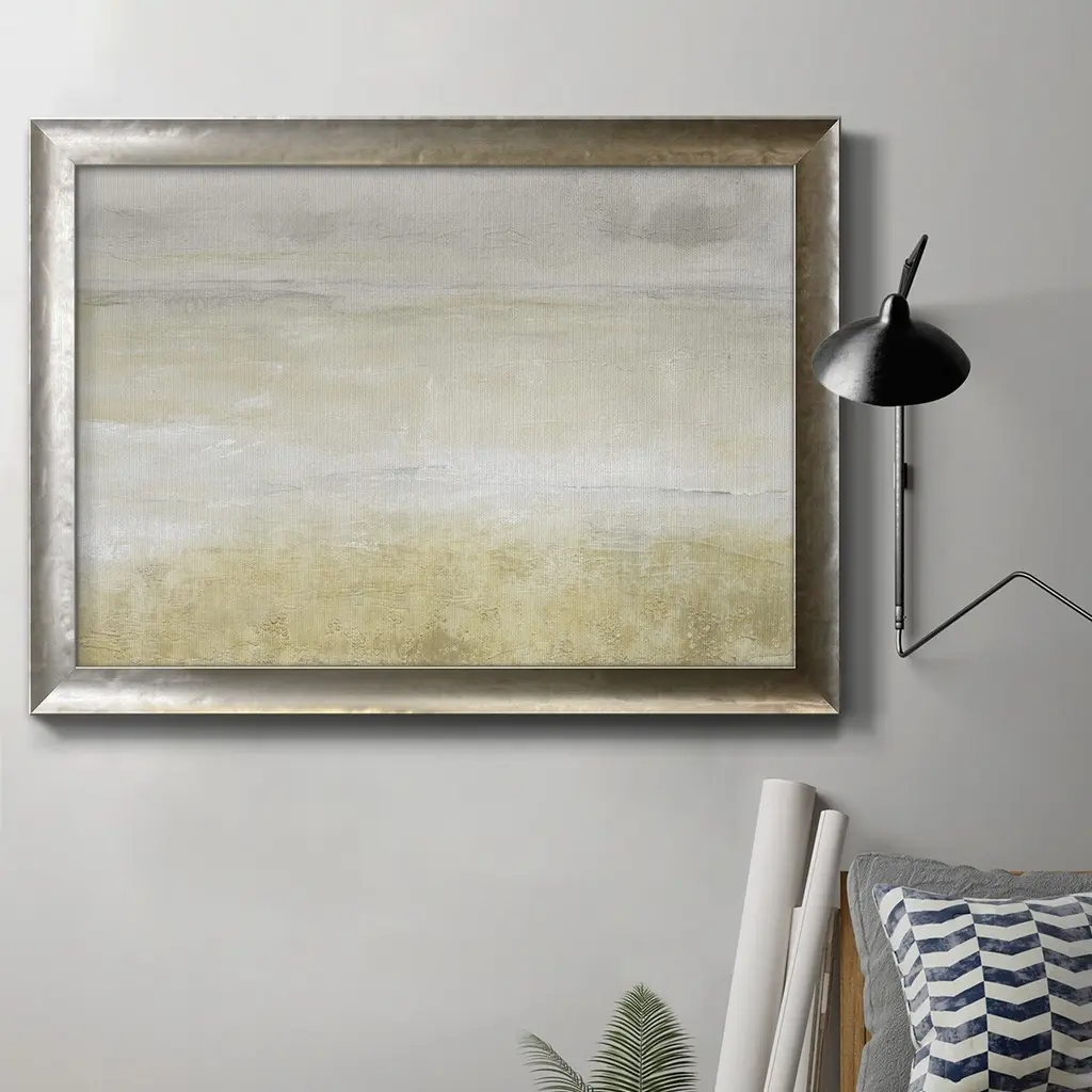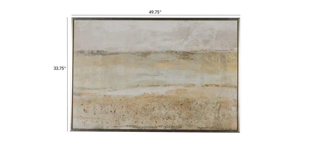 This unique giclée is hand-embellished with special shimmering touches to create an elegant abstract style. Artist Tim O’Toole reimagines a distant landscape in artful strokes of rich neutrals and warm golds. The abstract image is printed on canvas and then embellished by hand with graphite line work and pieces of natural, light-reflecting mica, giving it a glimmering textured finish. Set in a gold champagne float frame, this textured landscape painting exudes a warm, modern look that complements any style in any room.